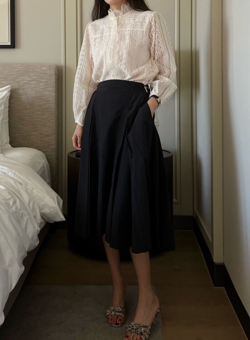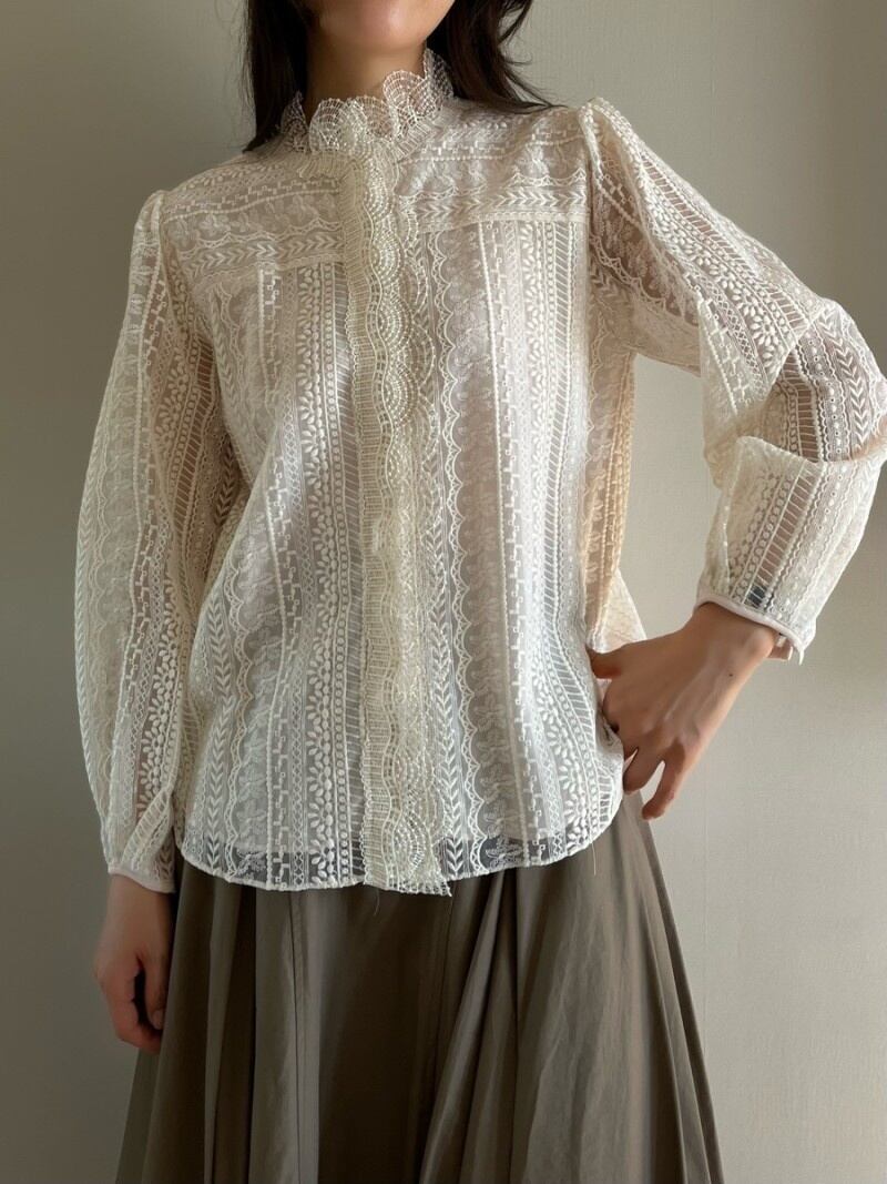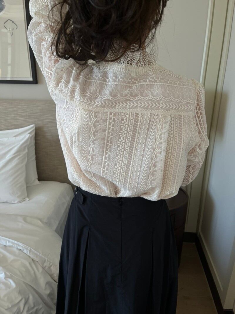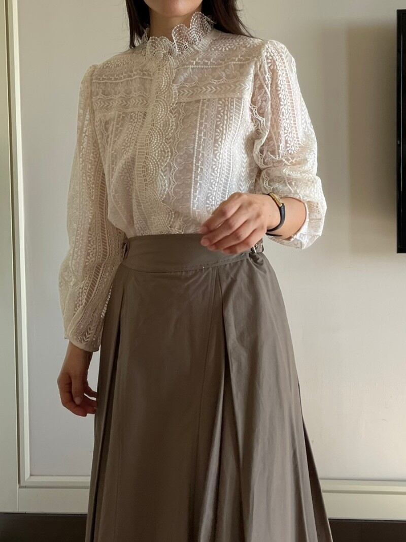 [EWQ] 甘いフックフラワーシャツランタンスリーブスタンドネックパッチワークブラウス秋潮トップ 16U2580 大人ガーリー スウィート キュート カジュアル オータム 秋物 フラワーデザイン