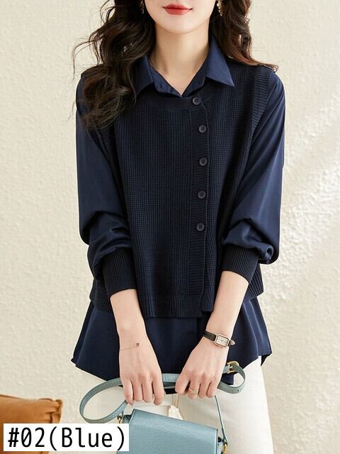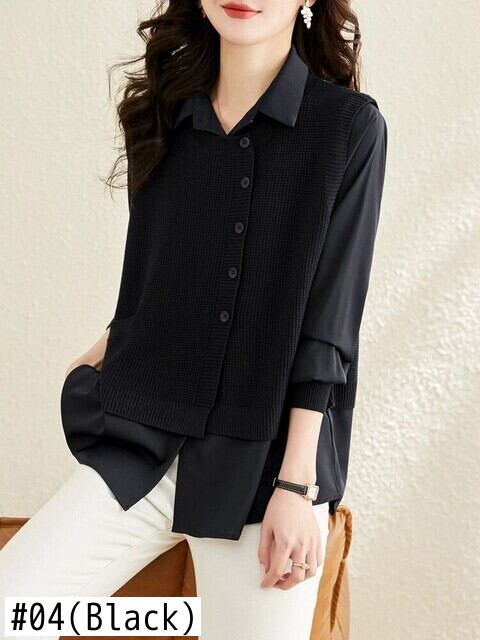 [EWQ] ボタン装飾ベスト ニット パッチワーク シャツ レディース 長袖 ルーズ ビッグサイズ セーター 秋潮トップ ロング オータム 秋物