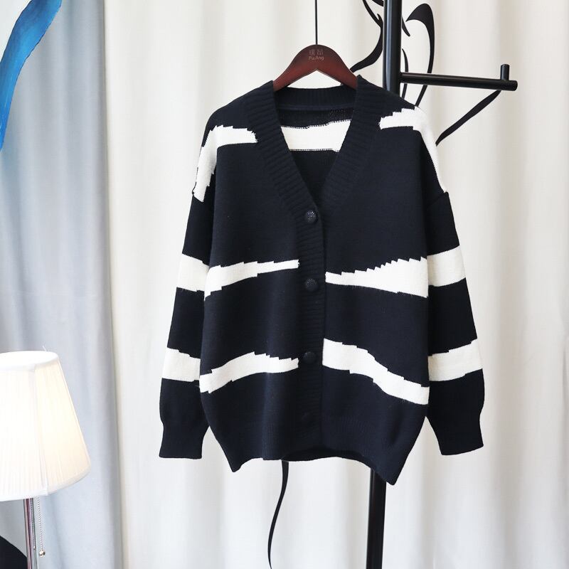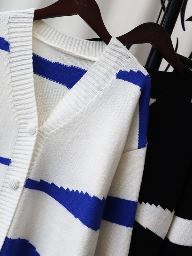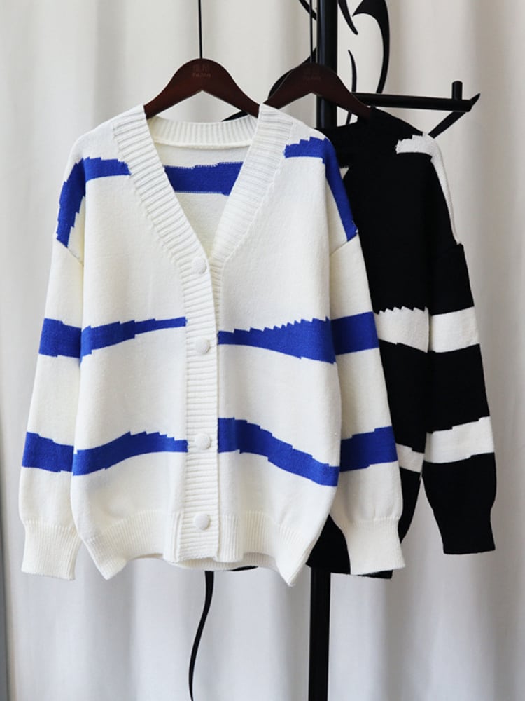 [EWQ] ストリートストライプ Vネック ニットカーディガン ジャケット コート ゆったり セーター トップス 大きいサイズ レディース 秋冬 オータム 秋物 ウィンター 冬物