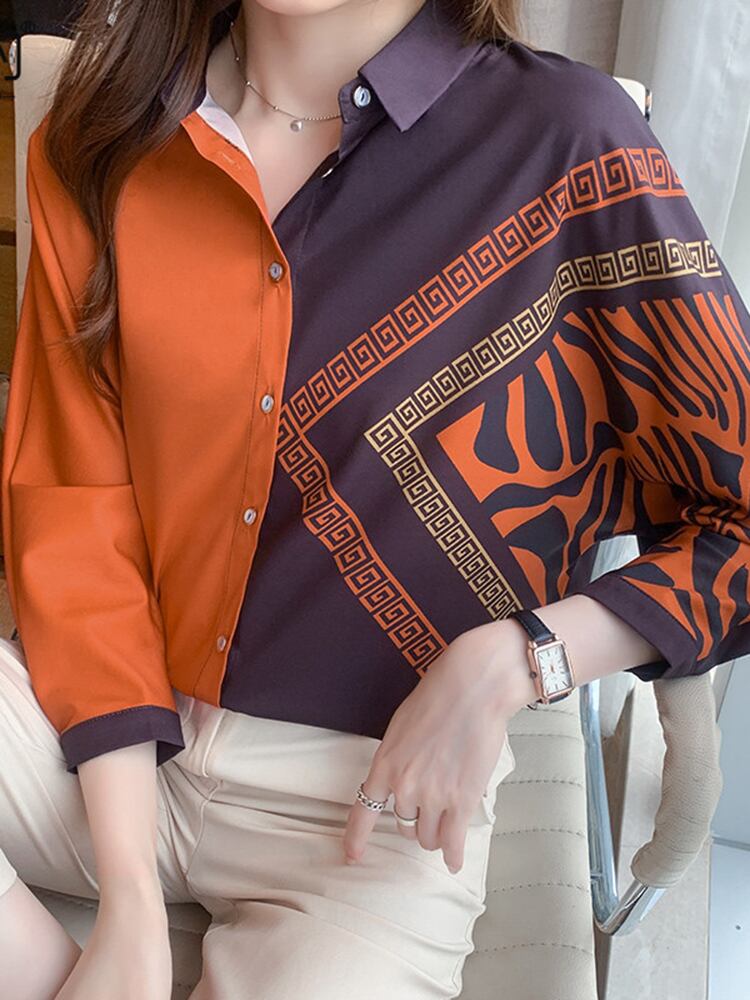 [EWQ] プリントコントラストシャツシングルブレスト長袖ルーズビッグサイズ秋潮ブラウストップ ロング オータム 秋物