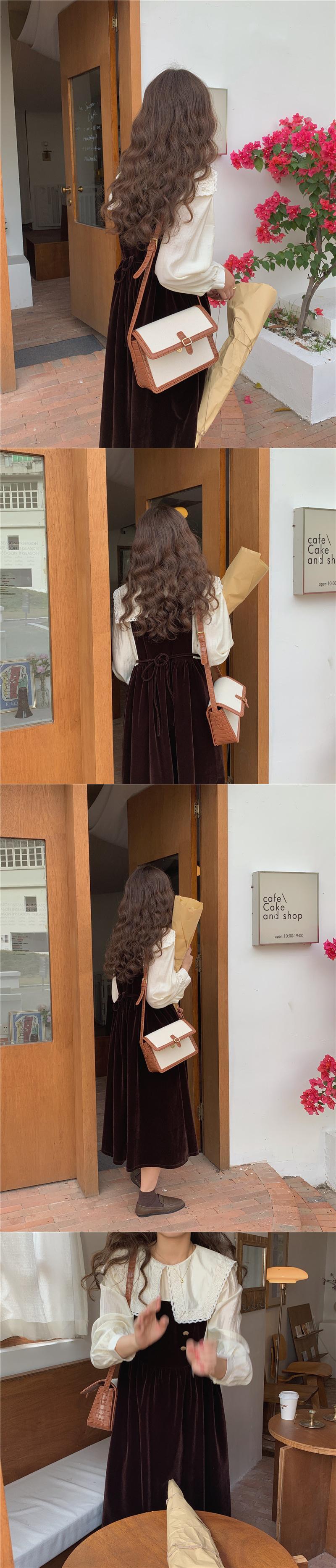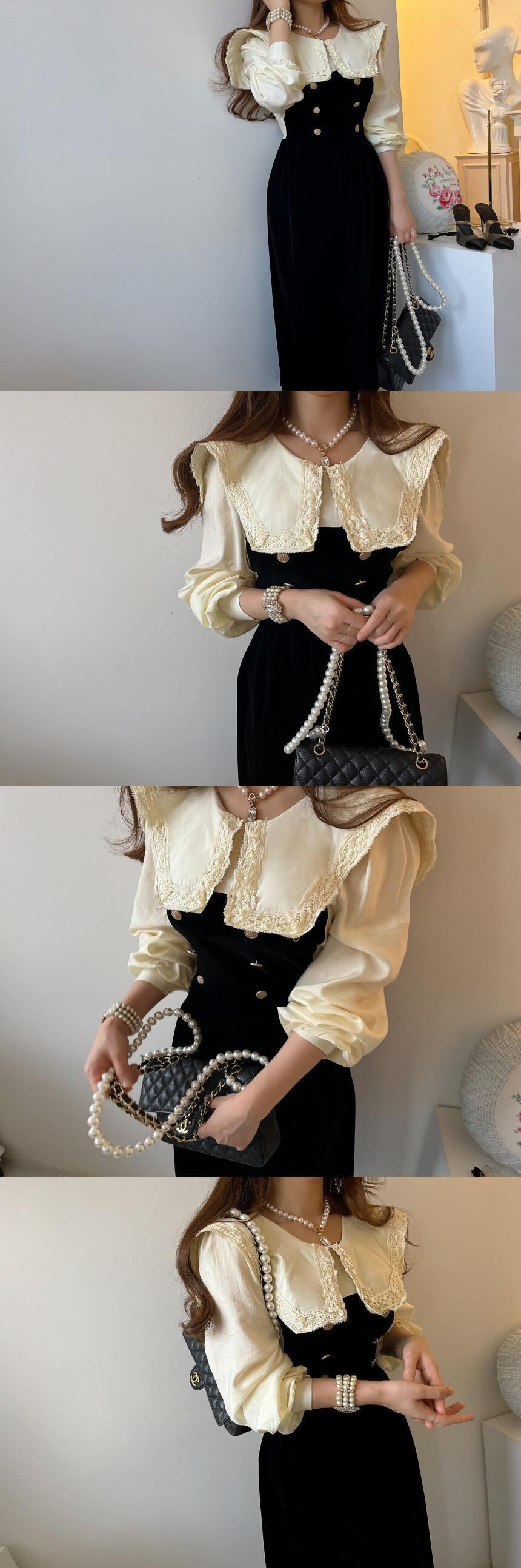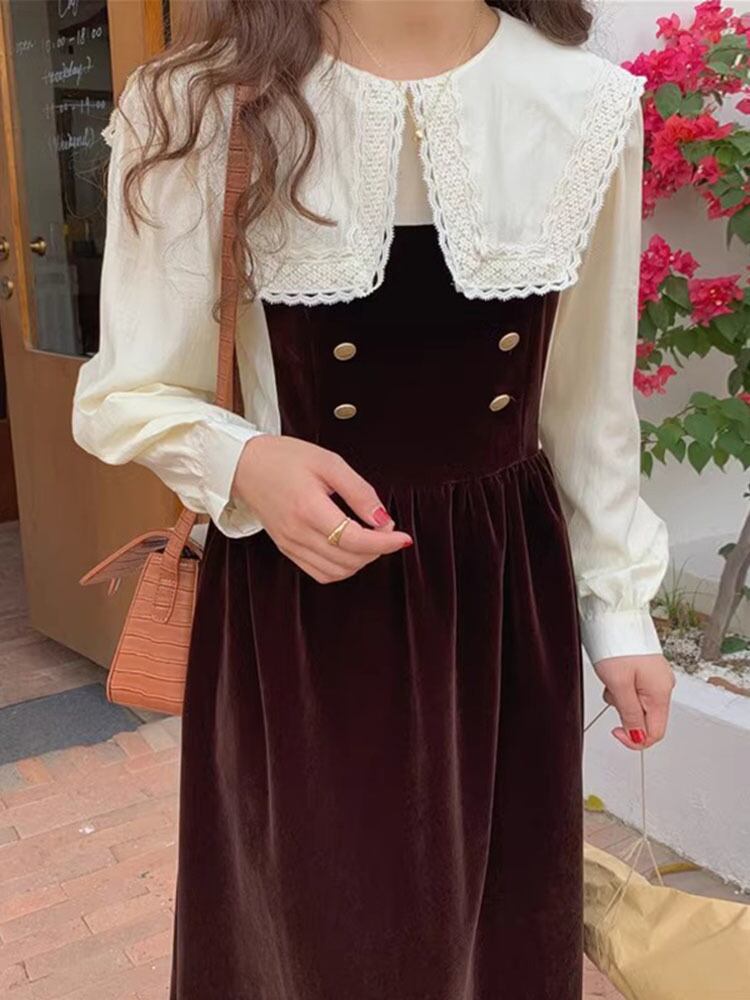 [EWQ] レトロセーラー襟フェイク 2 ピースパッチワークカラーコントラストドレス秋シックプリーツドレス オータム 秋物