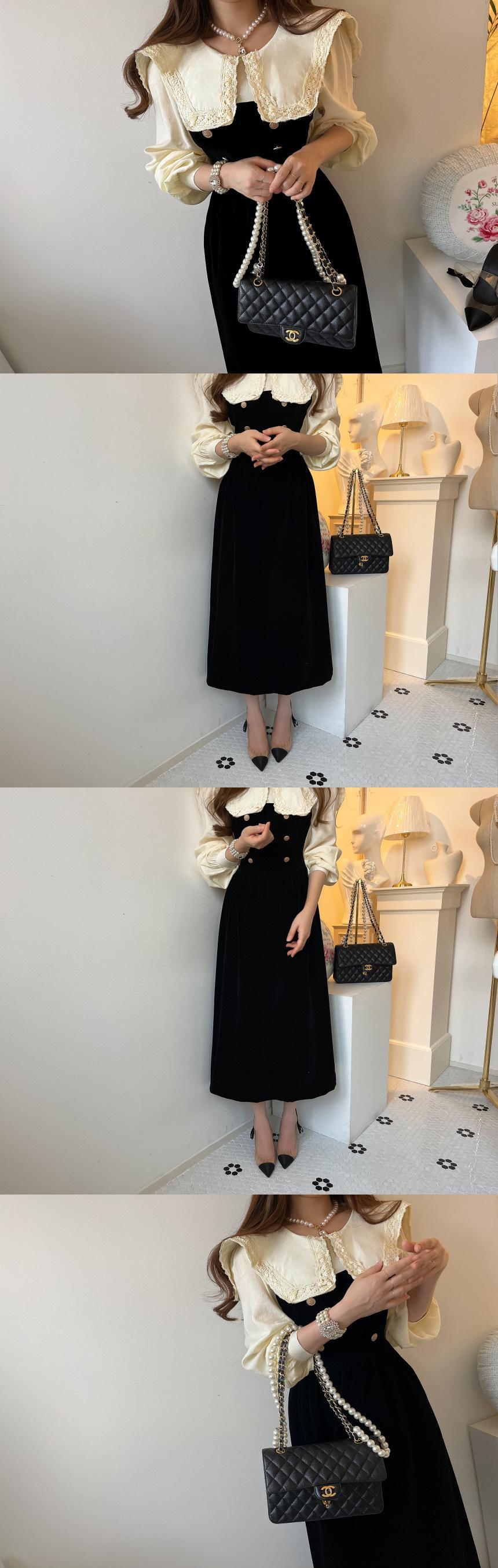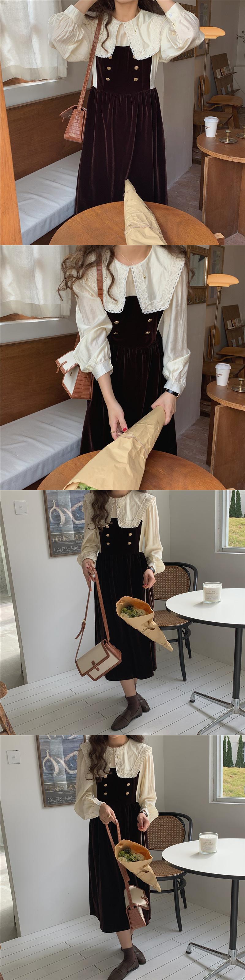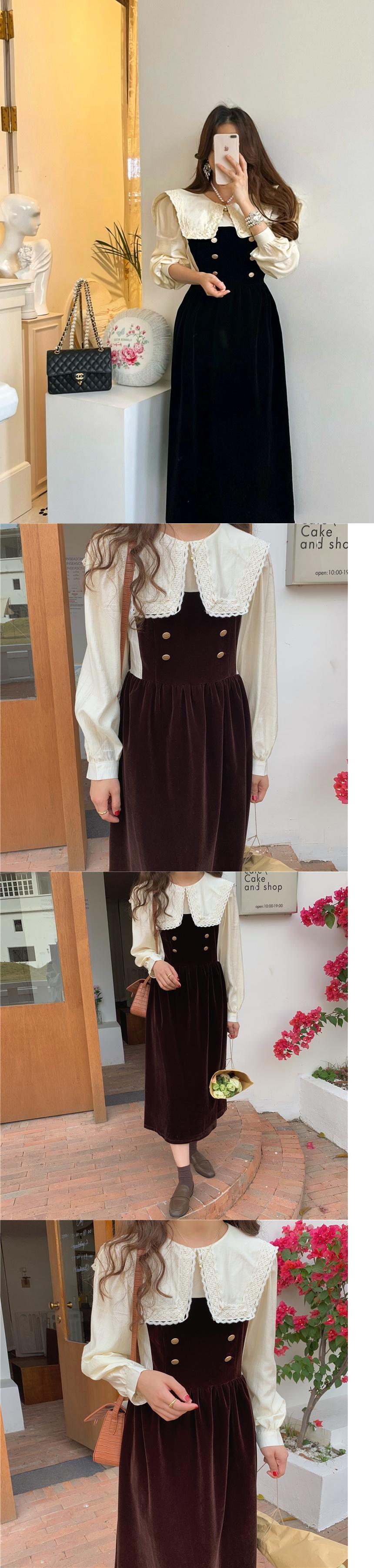 [EWQ] レトロセーラー襟フェイク 2 ピースパッチワークカラーコントラストドレス秋シックプリーツドレス オータム 秋物