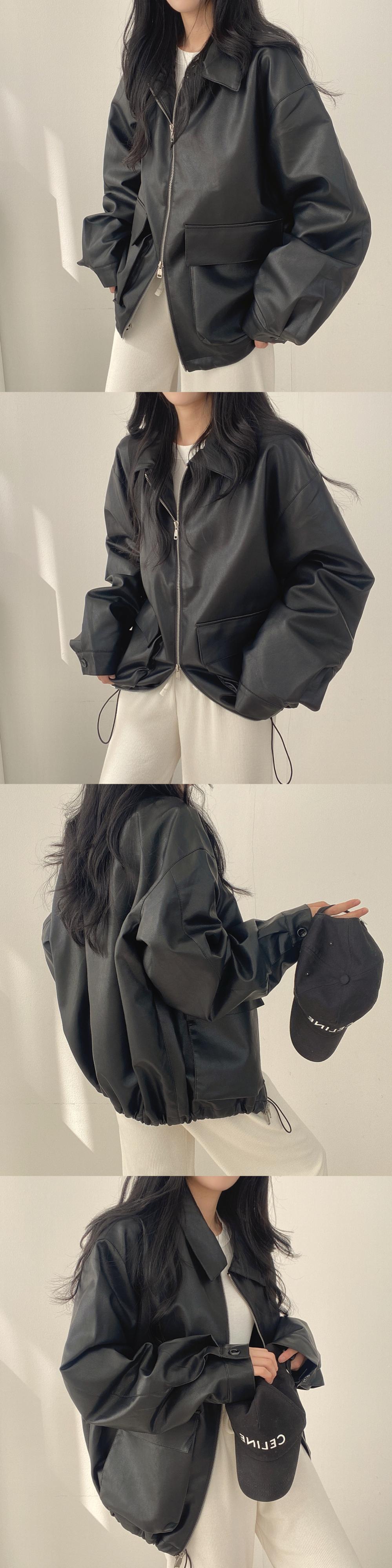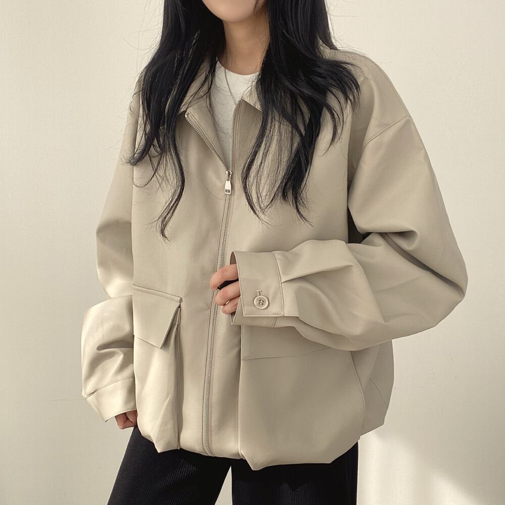 [EWQ] シック大きポケットジッパージャケット長袖ルーズ巾着 Pu レザージャケットコート秋生き抜く 6U10 ロング オータム 秋物