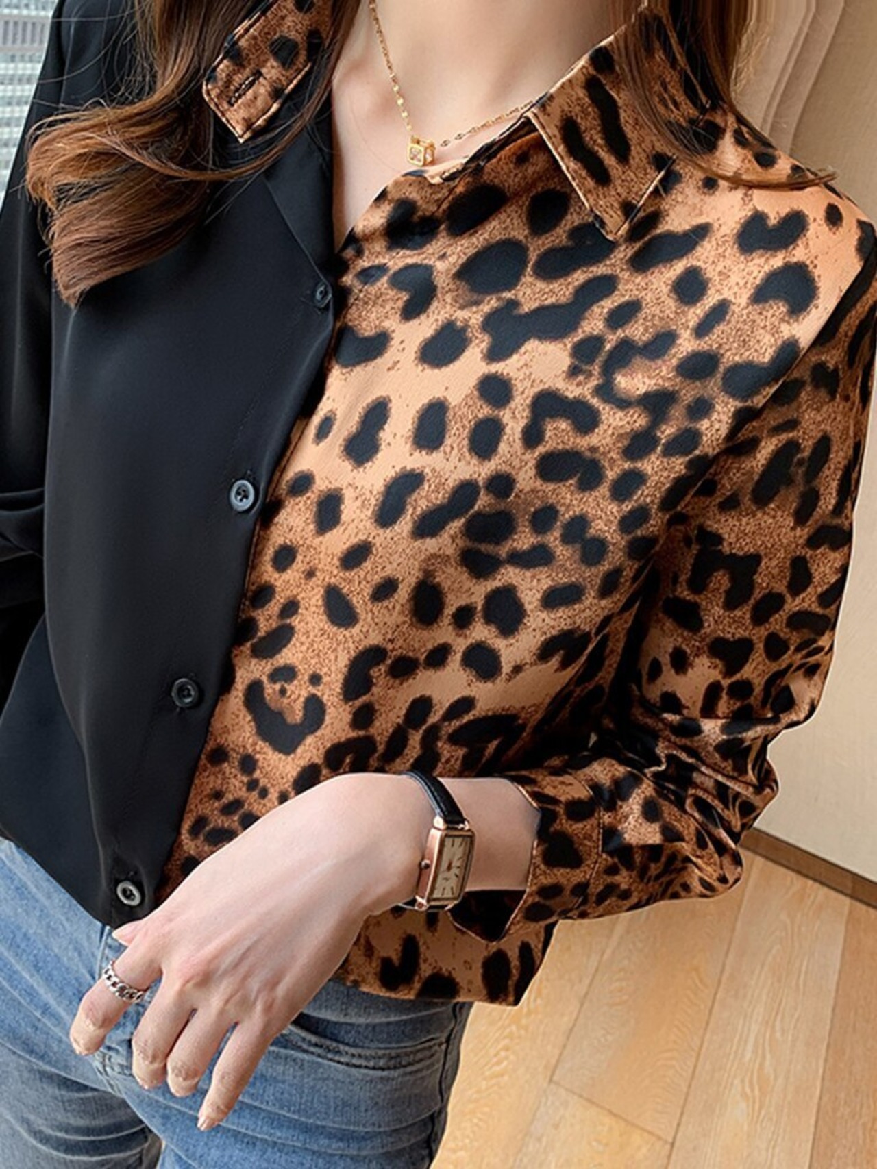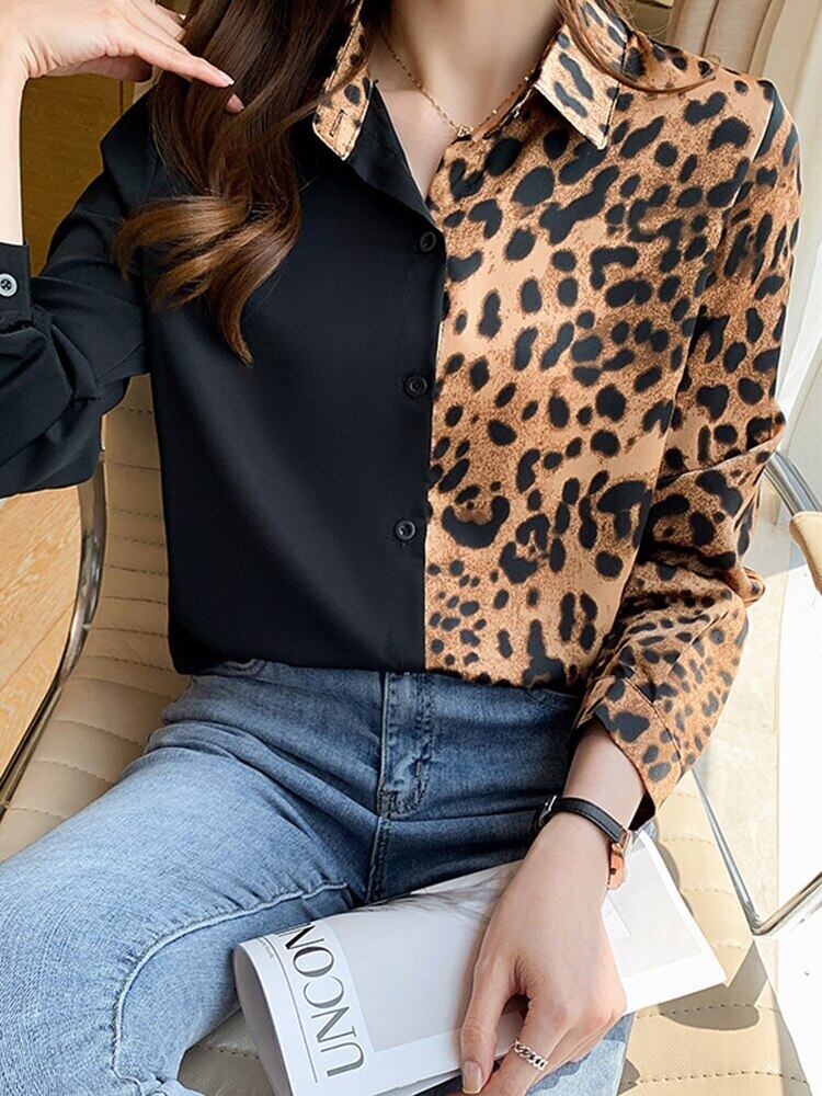 [EWQ] ヒョウ柄コントラストパッチワークシャツ長袖シングルブレスト秋潮トップス ロング オータム 秋物