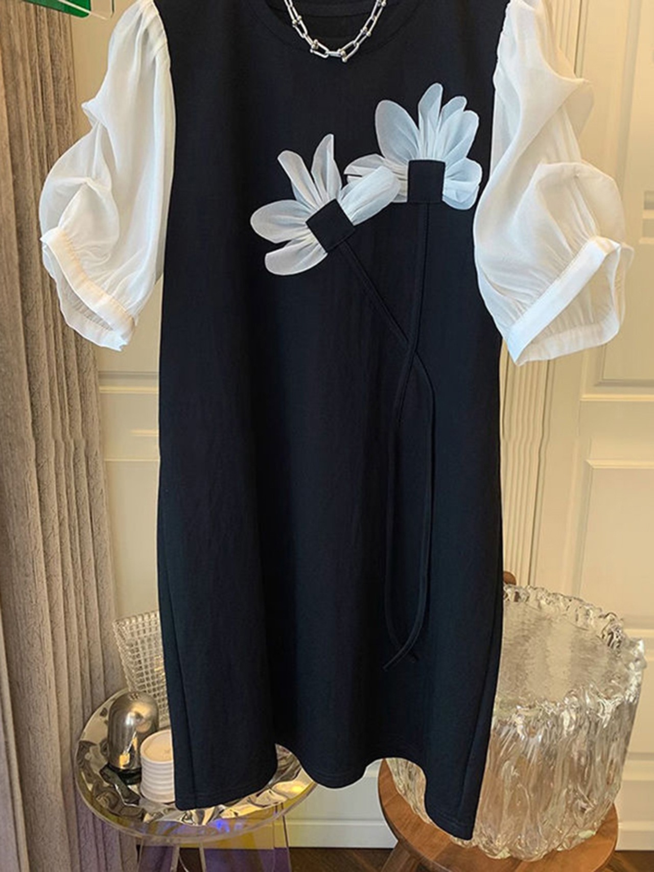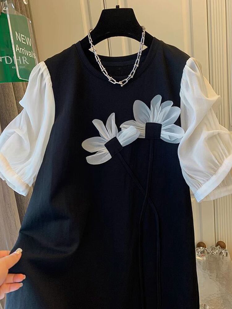 [EWQ] L-4XL ビッグサイズパッチワーク Tシャツドレスパフスリーブコントラスト 3D フラワースプライスドレス夏潮 Vestido サマー 夏物 フラワーデザイン
