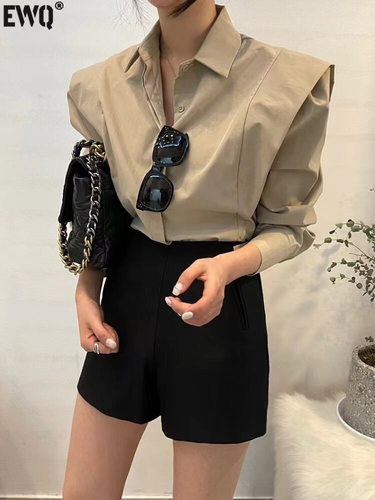 [EWQ] ゆったり長袖シャツ 秋 シンプル ポロボタン プレート フリル トレンド ロング ラッフル オータム 秋物