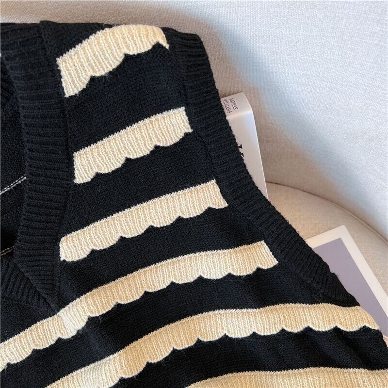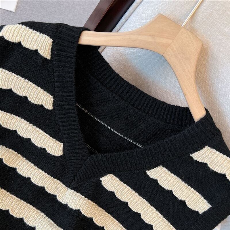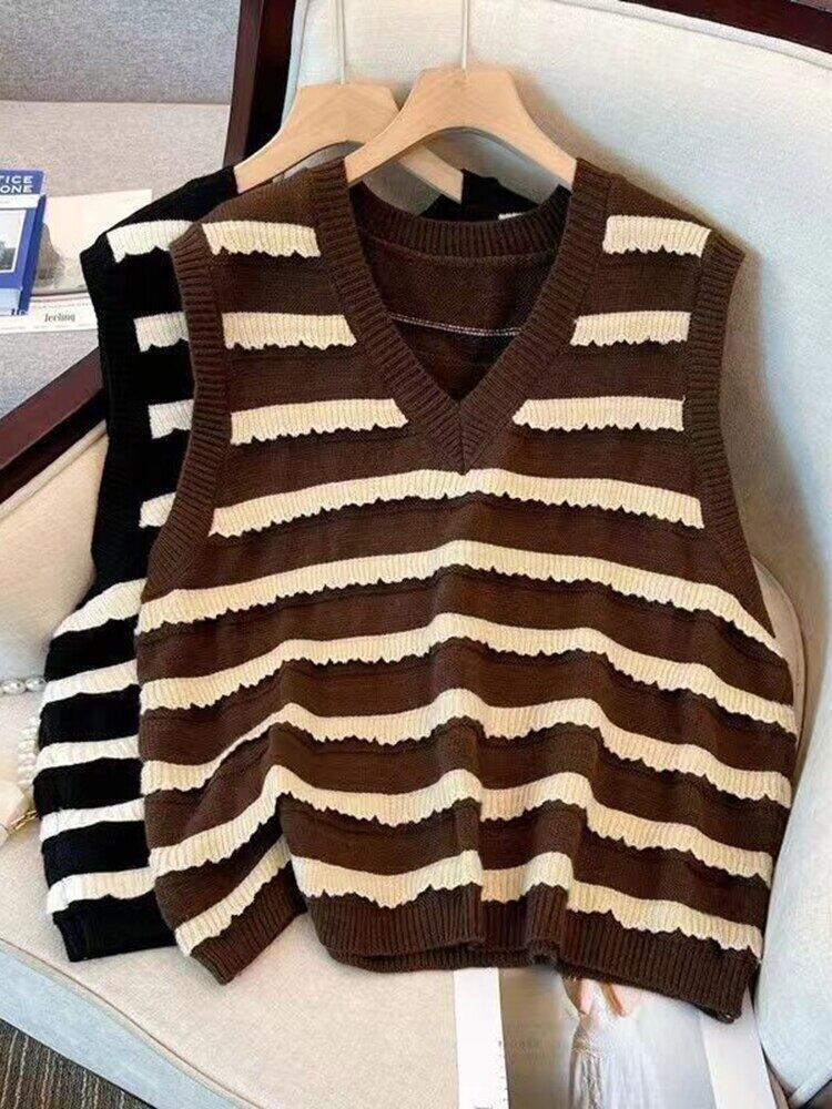 [EWQ] ストライプセーターベスト弾性 V ネックノースリーブニットタンク秋潮プルオーバーニットトップ エラスティック 伸縮 オータム 秋物 Vネック