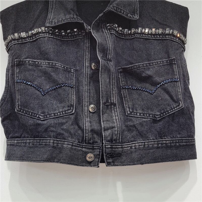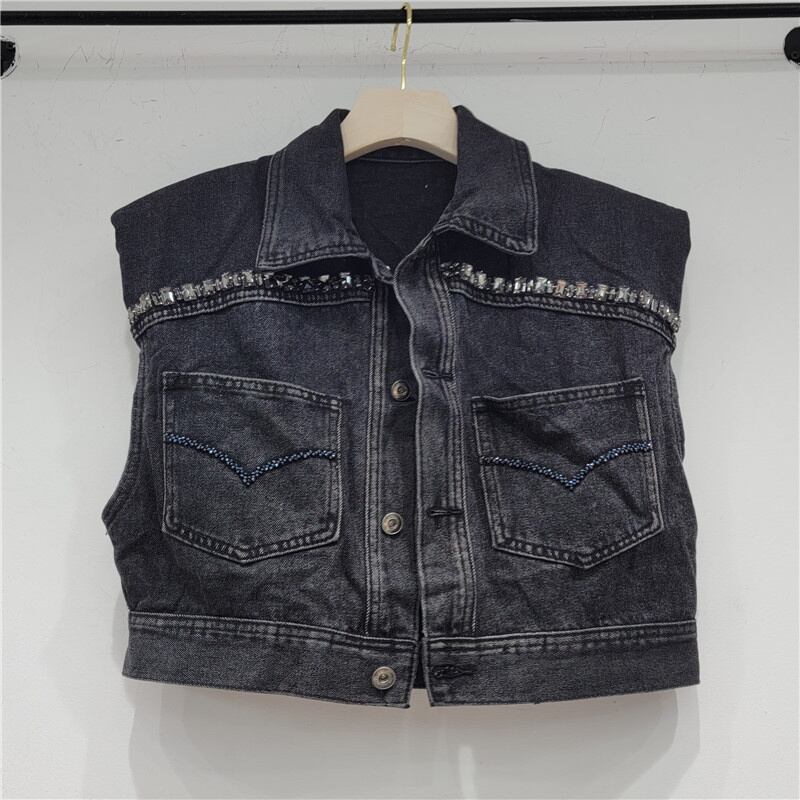 [EWQ] 秋ブラックデニムベストシングルブレストダイヤモンド装飾ノースリーブジャケット潮チョッキ 420 オータム 秋物