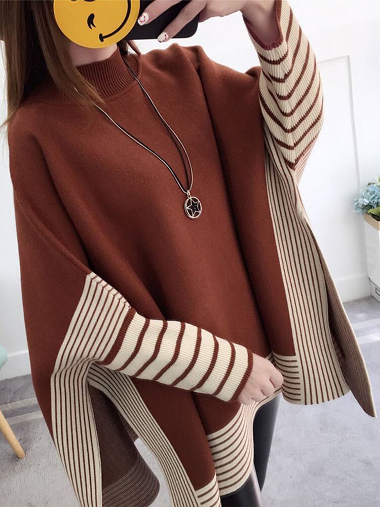 [EWQ] バットウィングスリーブストライプコントラストセーター O ネックルーズオーバーサイズサイドスプリットニットプルオーバー秋ニットトップ オータム 秋物 Oネック