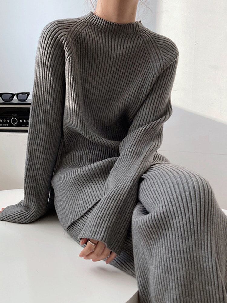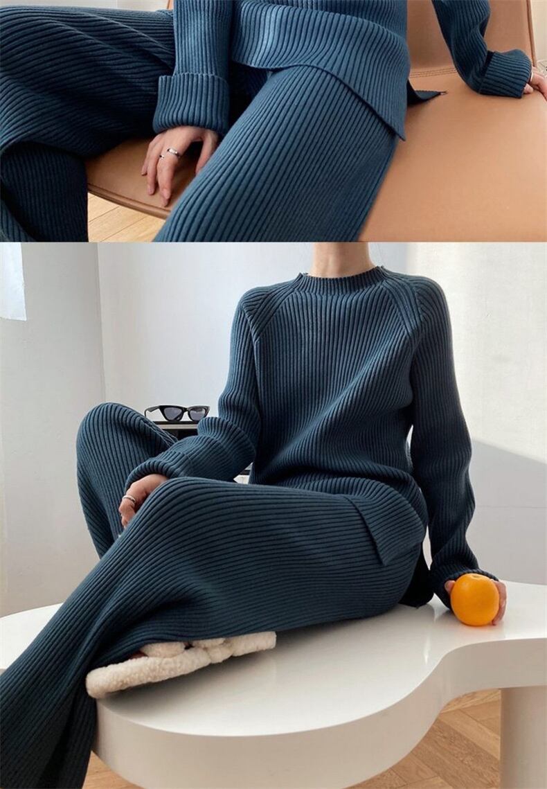 [EWQ] O ネック長袖スプリットルーズニットプルオーバー + ウエスト弾性ニットワイドレッグパンツ秋潮 ロング エラスティック 伸縮 オータム 秋物 Oネック ワイドパンツ
