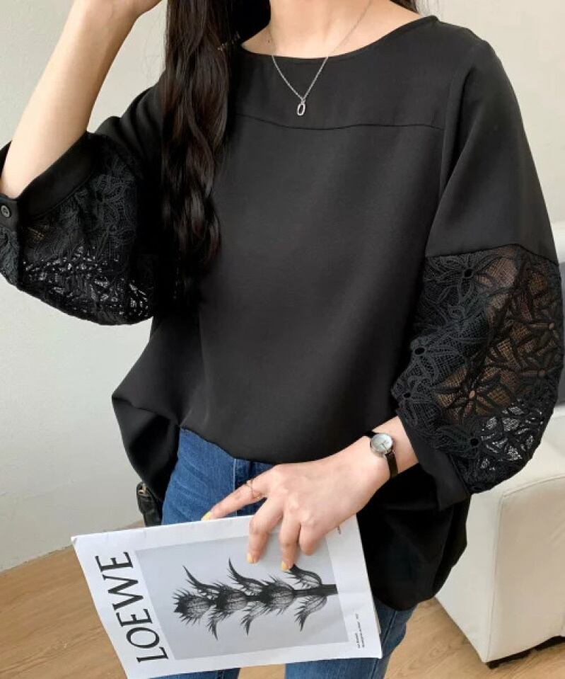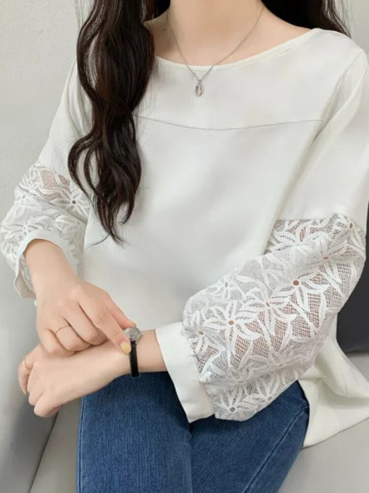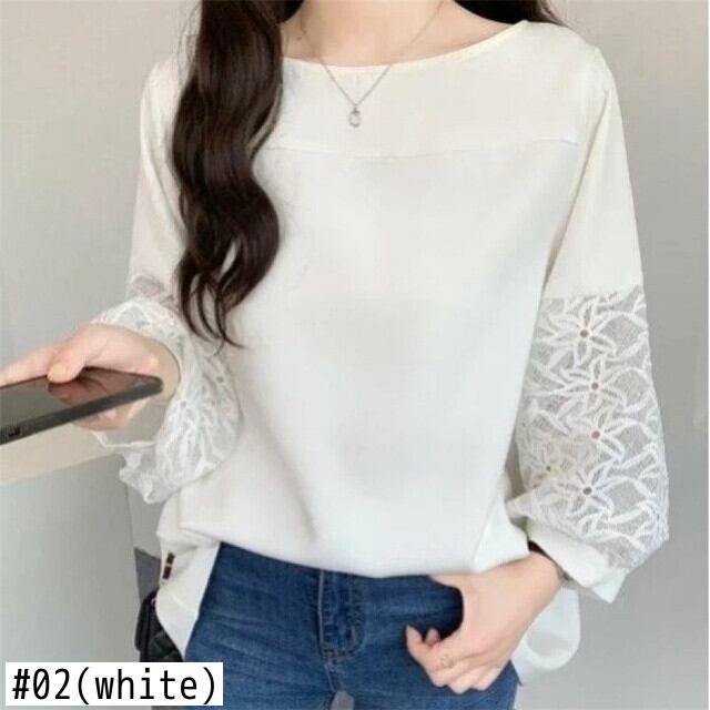 [EWQ] ルーズ シャツ 長袖 フック フラワー パッチワーク ソリッド O ネック 秋潮 レディース ホワイト トップ 2362 ロング オータム 秋物 Oネック ソリッドカラー フラワーデザイン