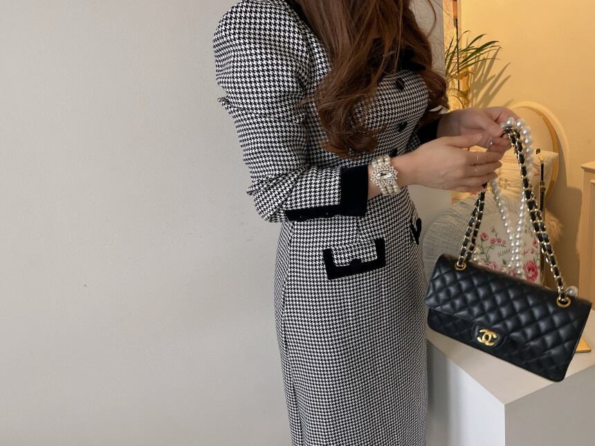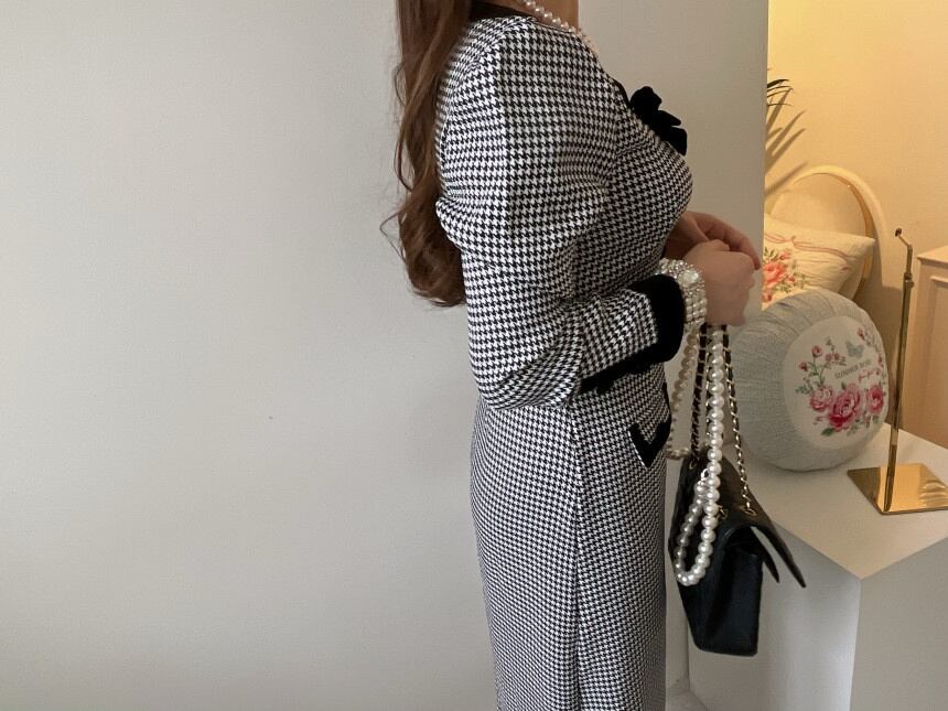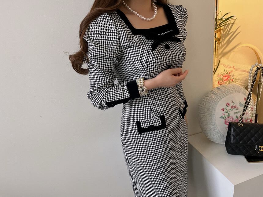 [EWQ] レトロスクエアカラーパフスリーブチェック柄パッチワークスリムドレス秋カラーコントラストドレス 16O470 オータム 秋物 スクウェア