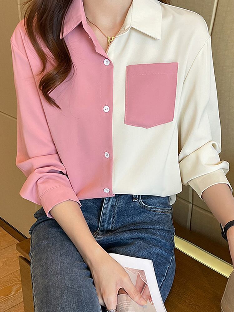 [EWQ] パッチワーク コントラスト シャツ レディース 長袖 シングルブレスト ポケット スプライシング ビッグサイズ 秋 トップス ロング オータム 秋物