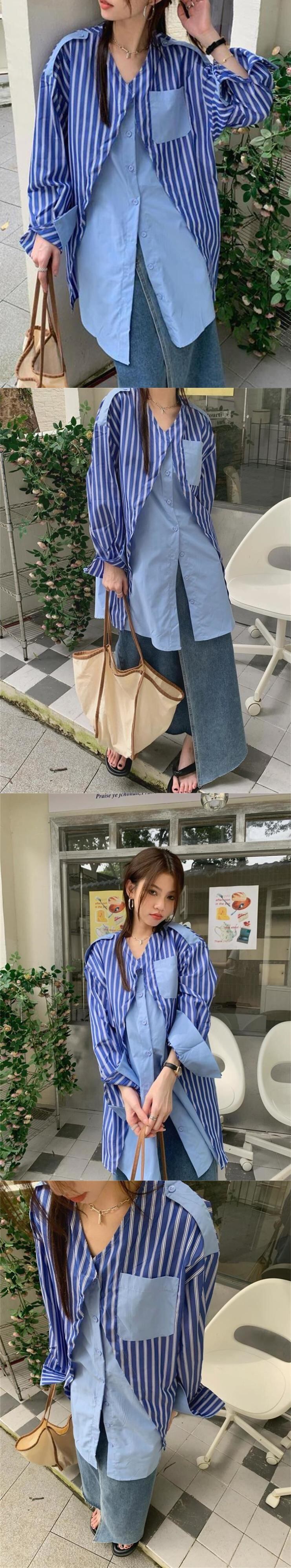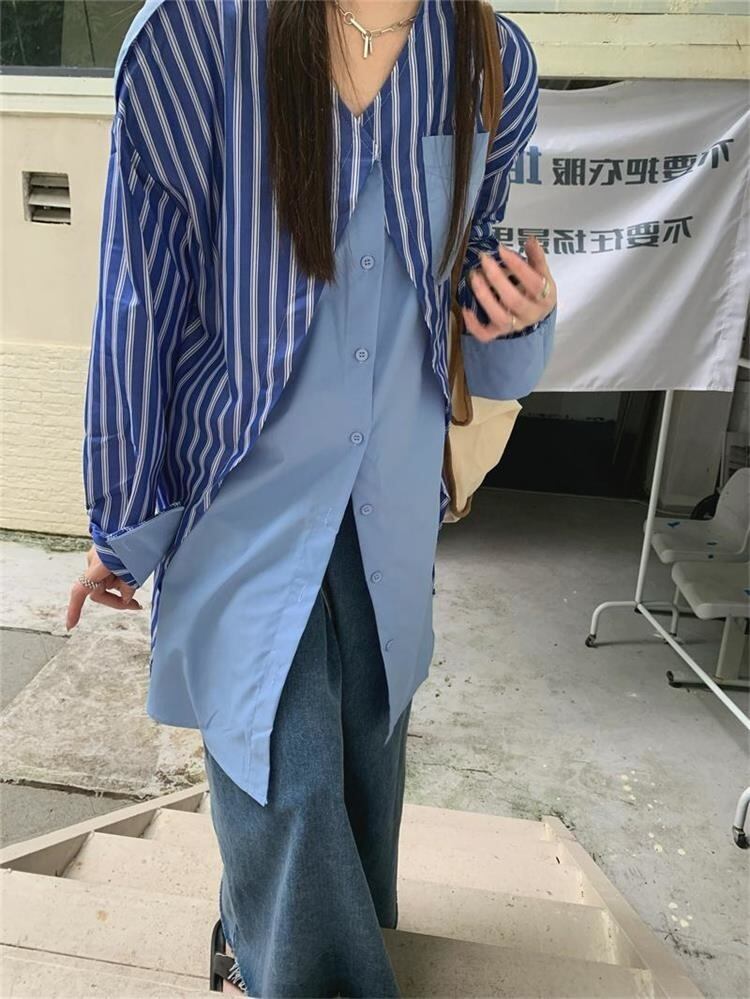 [EWQ] ビッグサイズシャツフェイクツーピース長袖ストライプコントラストカラールーズ秋潮ブラウストップ ロング オータム 秋物
