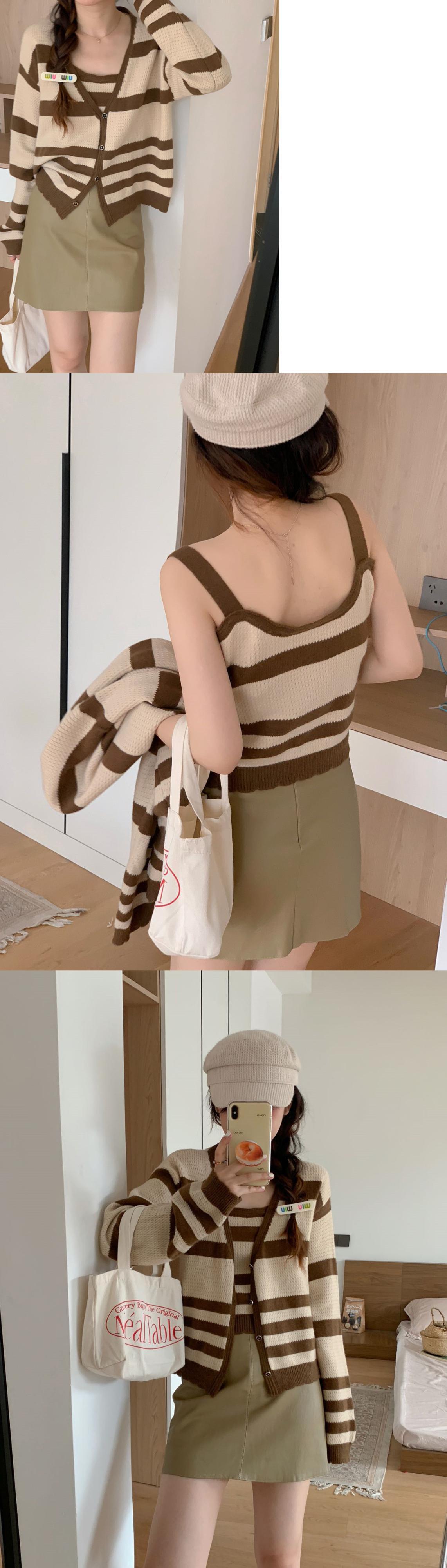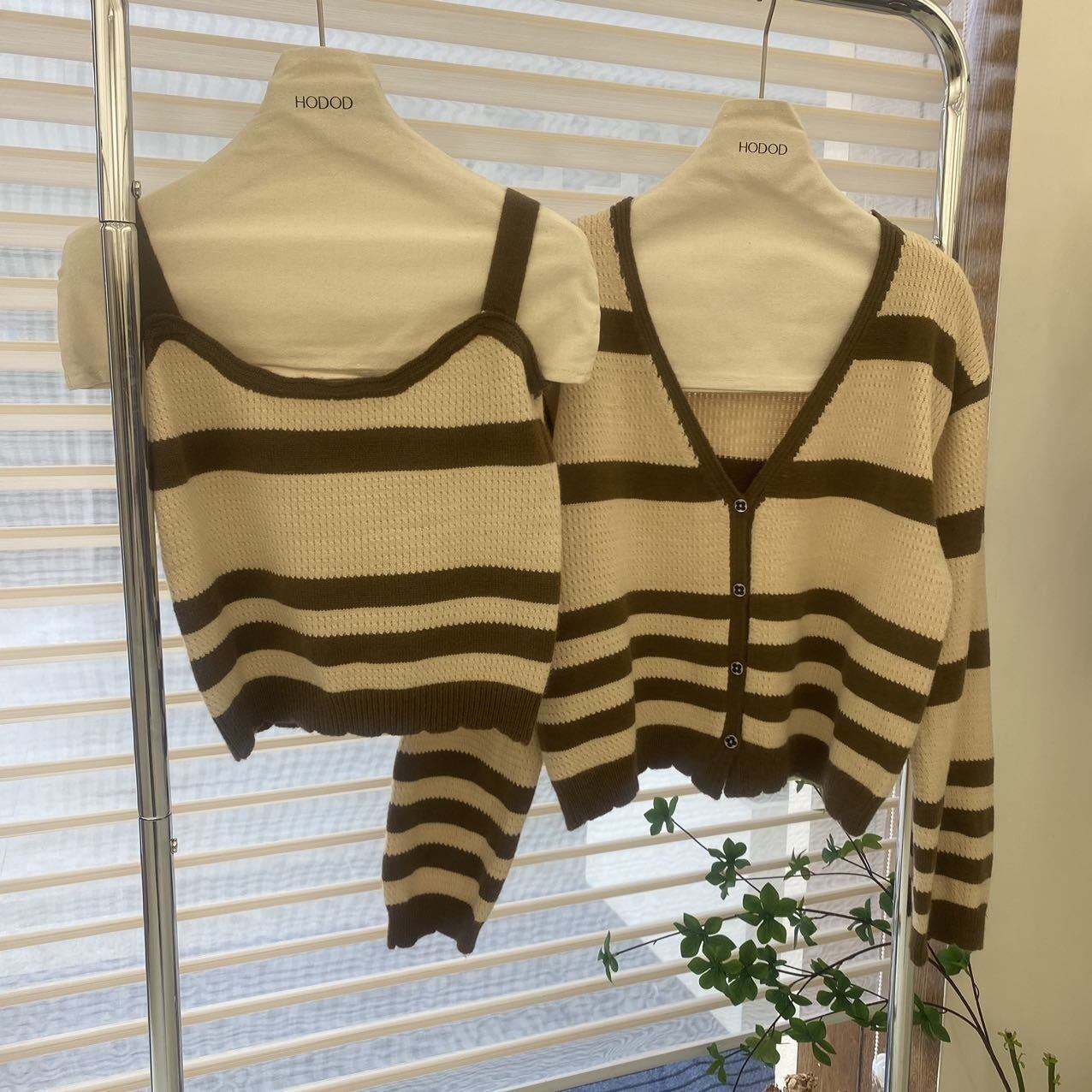 [EWQ] ストライプコントラストルーズセーターカーディガン + ノースリーブ弾性ニットベスト秋冬潮ニットコート エラスティック 伸縮 オータム 秋物 ウィンター 冬物