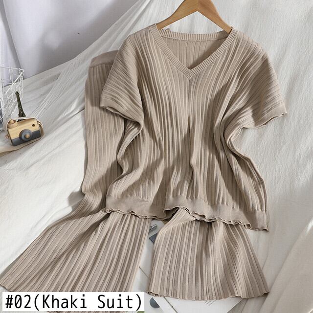 [EWQ] スーツ夏潮ソリッドカラー V ネック半袖ニットウェアトップ + ワイドレッグパンツプリーツニットセット ショート ハーフスリーブ サマー 夏物 Vネック ワイドパンツ
