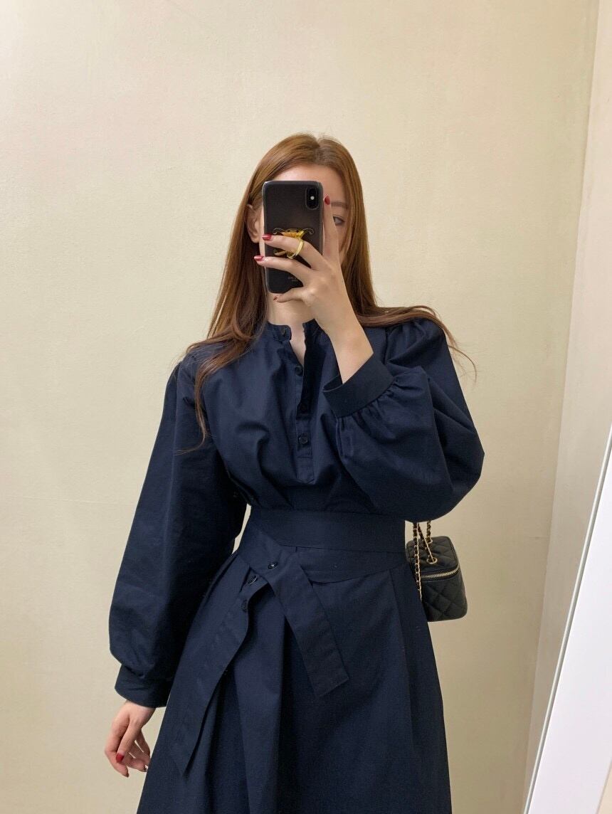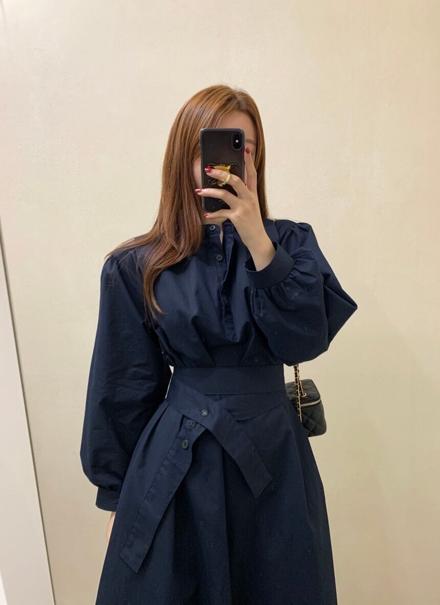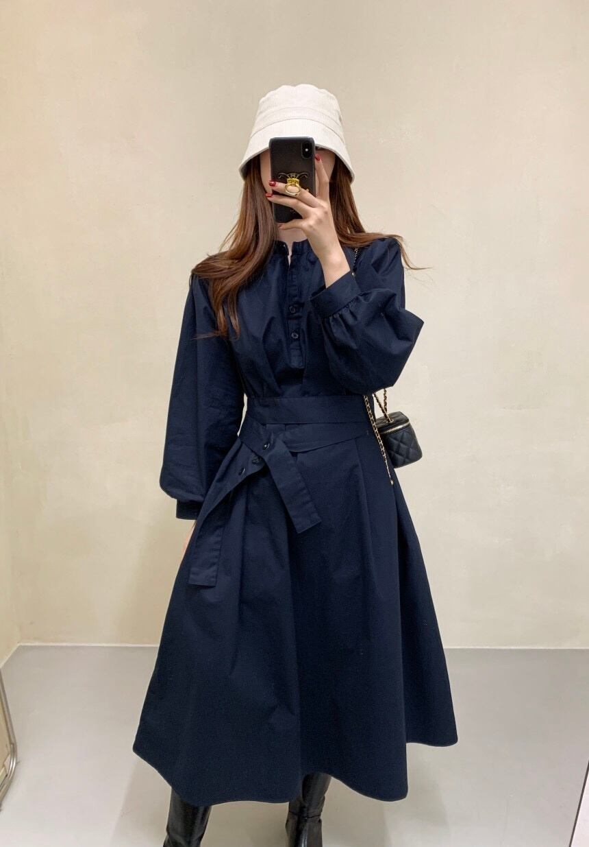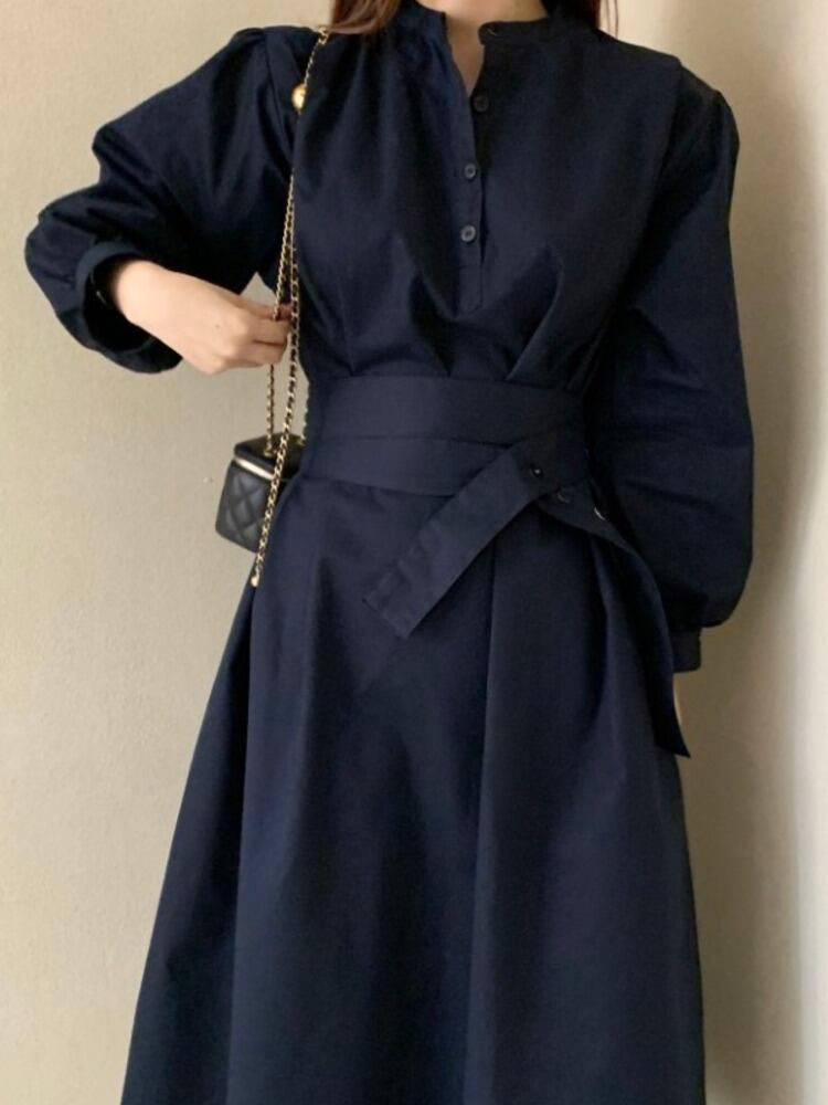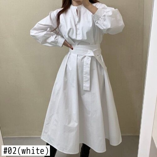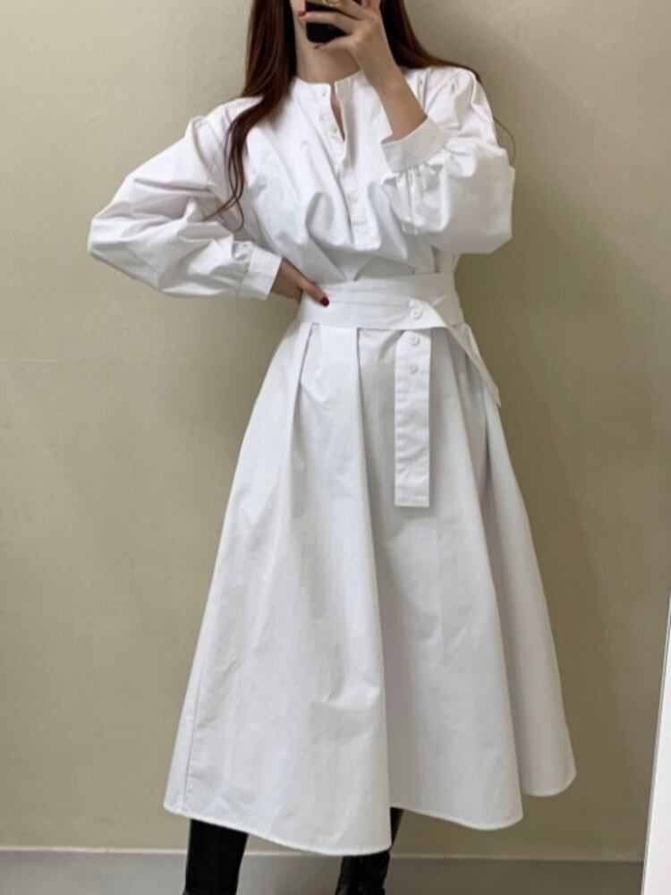 [EWQ] スタンド包帯シャツドレスランタンスリーブスリムウエストホワイトドレス秋潮 Vestido U1452 オータム 秋物
