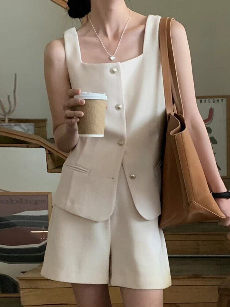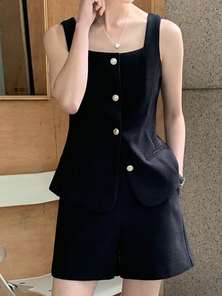 【EWQ】2点セット スクエアネック シングルブレスト タンクトップ+ウエストワイドレッグショーツ 秋冬 16U4342 オータム 秋物 ウィンター 冬物 ブルマー ワイドパンツ スクウェア