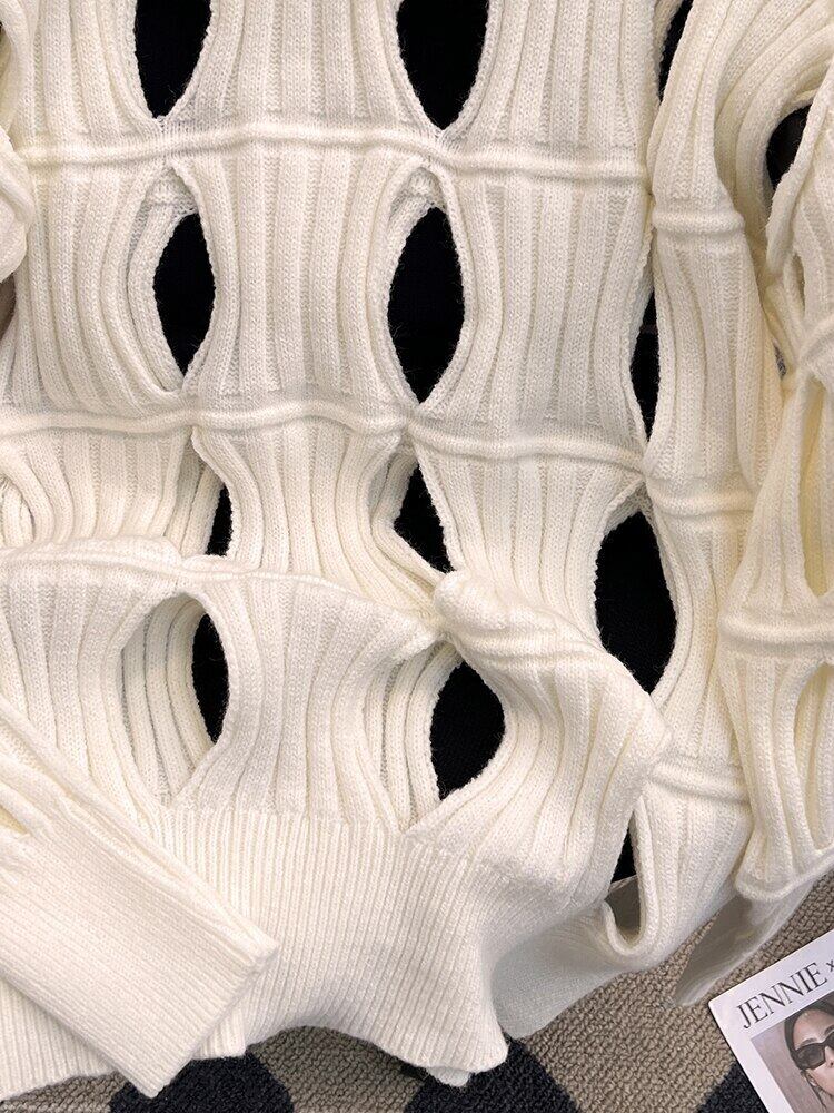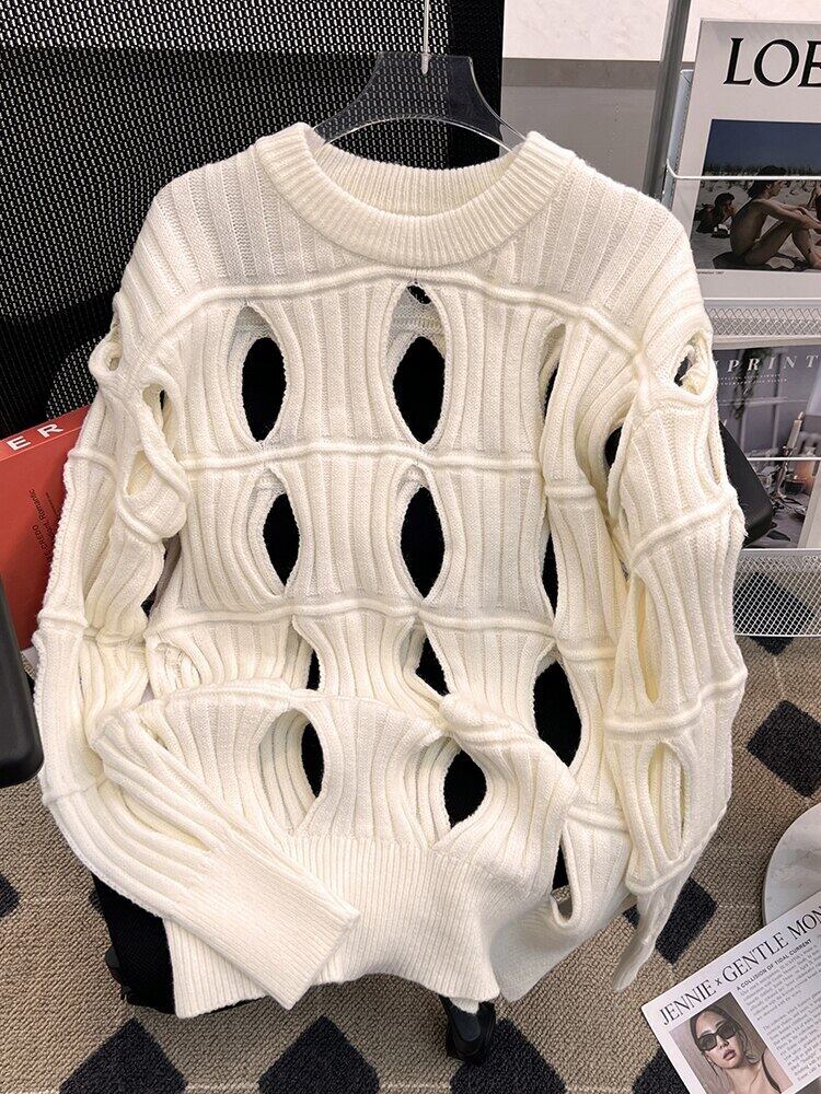 [EWQ] 有能 中空セーター 秋 薄手 長袖 プルオーバー ニット トップス タイドフェマル ゆったりニットトップス 16U3184 ロング オータム 秋物