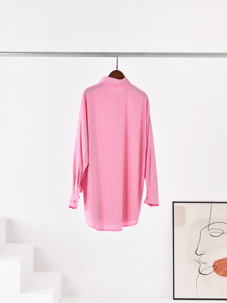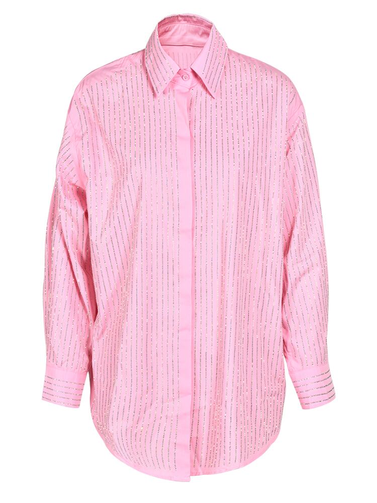 [EWQ] レディース ビッグサイズ 長袖 ピンク ブラウス 秋 ダイヤモンド ストライプ ピンク シャツ タイド トップ 16U638 ロング オータム 秋物