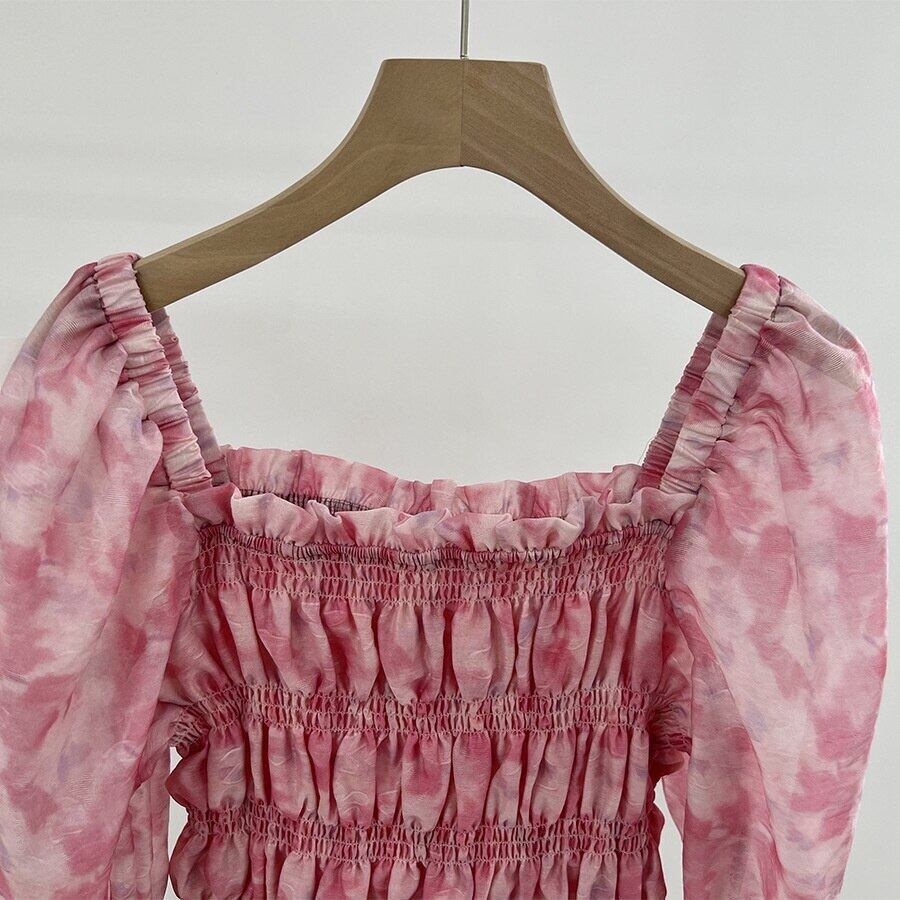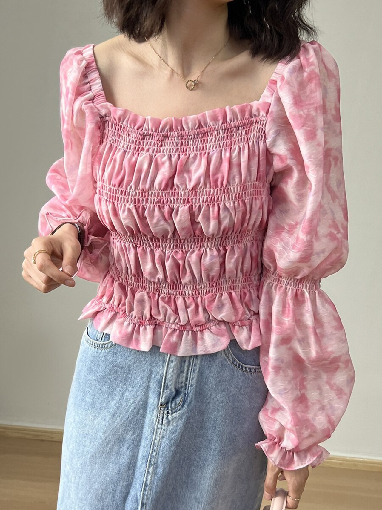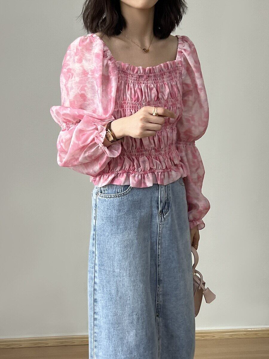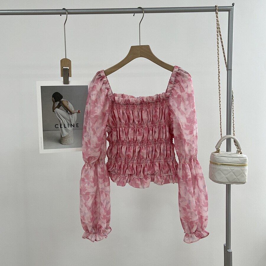 [EWQ] プリーツ弾性プリントシャツスイートランタンスリーブスクエアネックコントラストカラー秋潮トップ 16U3440 エラスティック 伸縮 大人ガーリー スウィート キュート カジュアル オータム 秋物 スクウェア