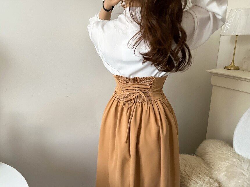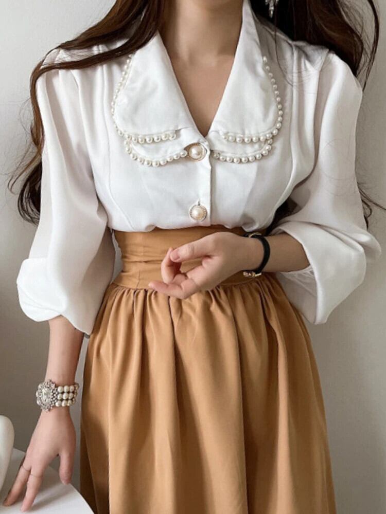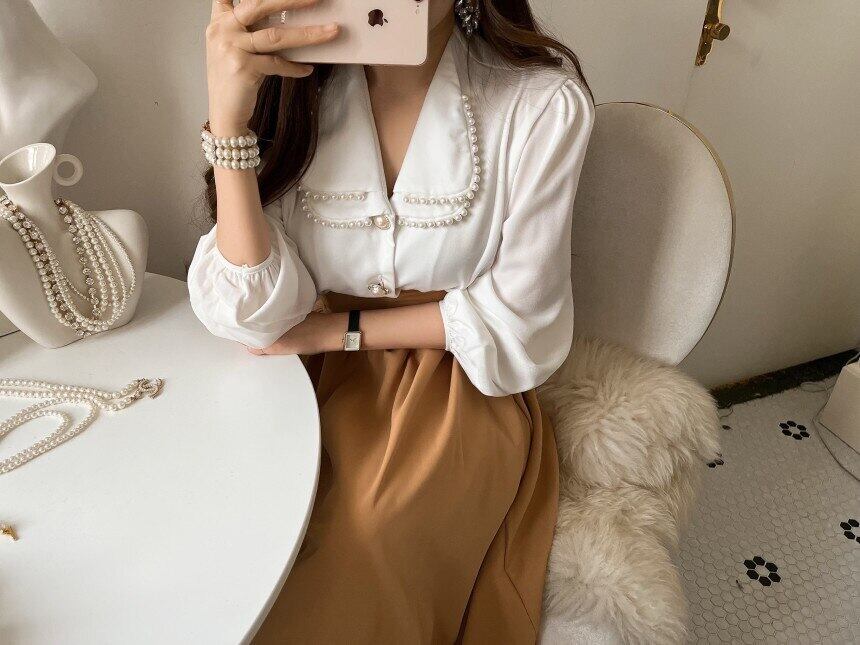 [EWQ] レディース シャツ ダブルラペル パール装飾 ランタン スリーブ オータム タイド トップ 2581 ランタンスリーブ 秋物 真珠