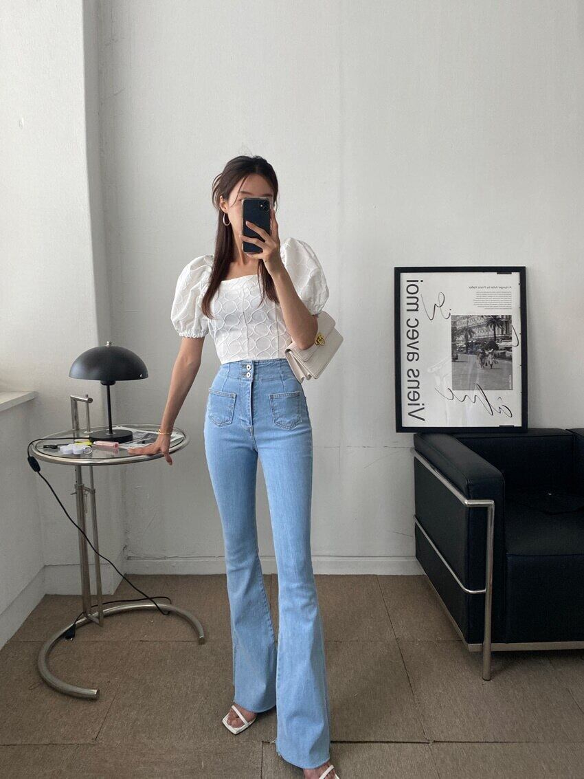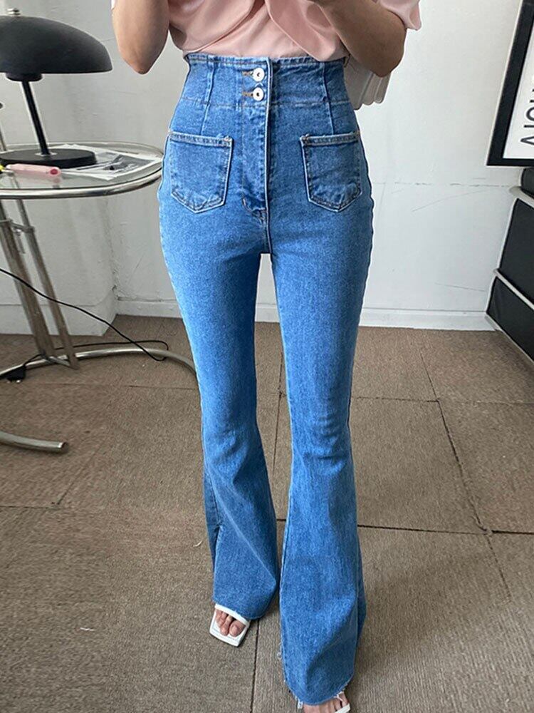 [EWQ] シックウエスト 2 つボタンスリムジーンズパンツ秋スプリットデニムフレアパンツ 420 オータム 秋物