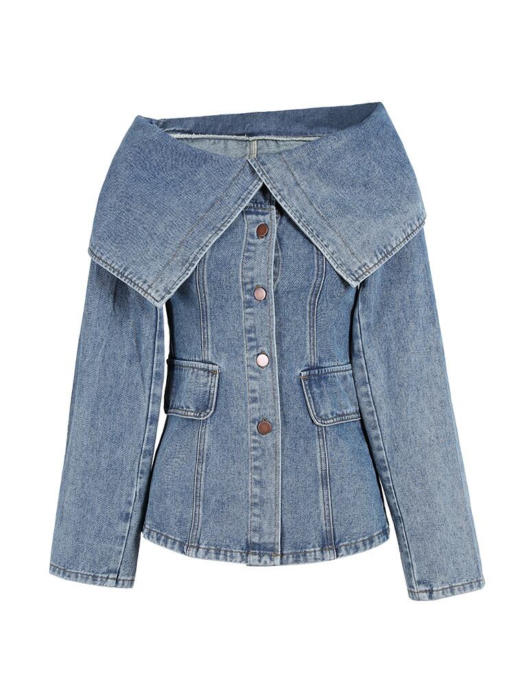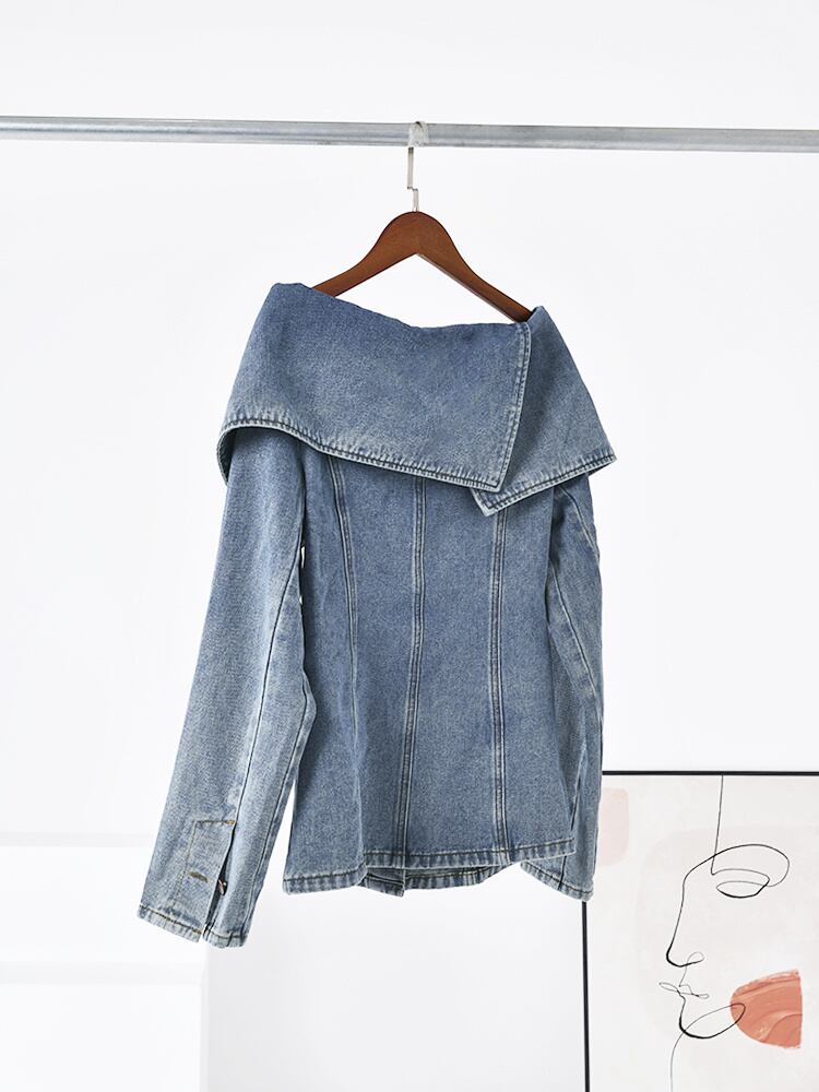 [EWQ] デニムジャケットパッチワークオフショルダーセクシーシングルブレストポケットブルージャケット秋生き抜く服 オータム 秋物