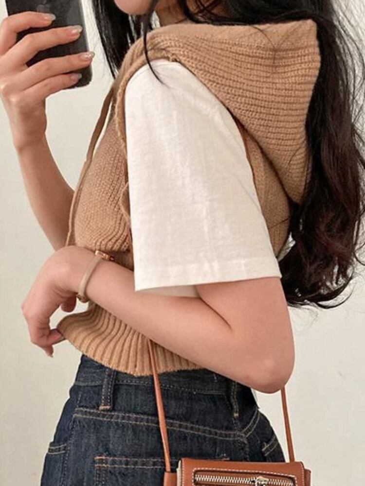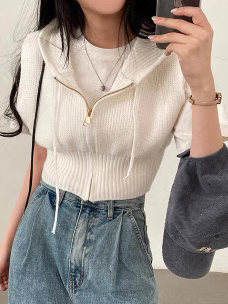 [EWQ] 巾着フード付きニットベストジップアップノースリーブショートニットチョッキ秋薄い潮服 オータム 秋物