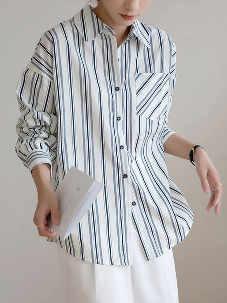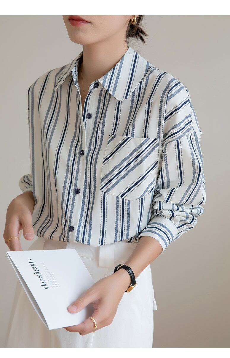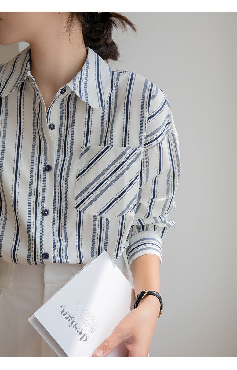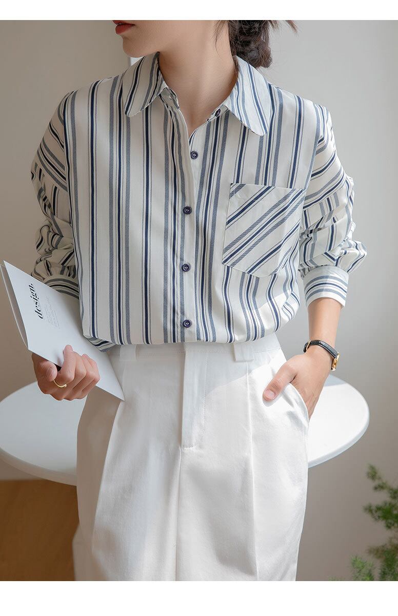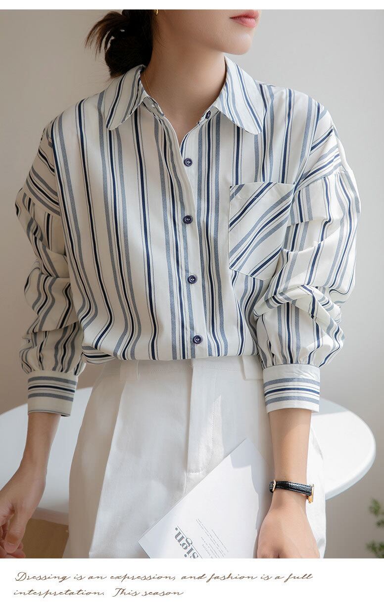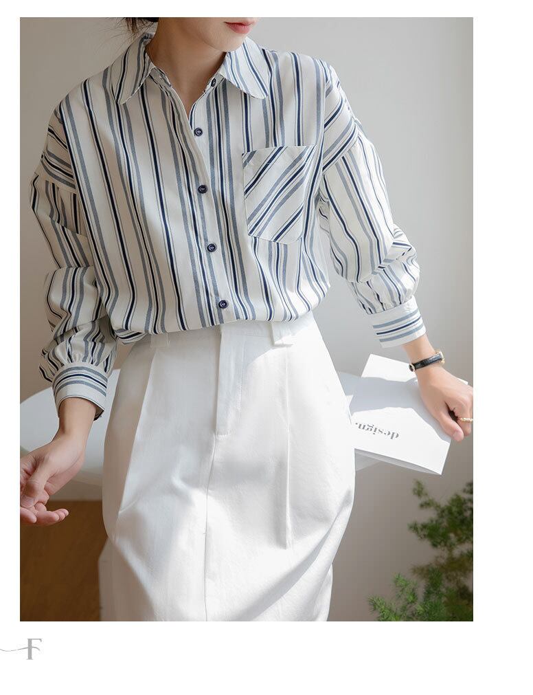 [EWQ] ルーズストライプシャツシングルブレスト長袖ポケットパッチワーク秋潮トップ 16U2274 ロング オータム 秋物
