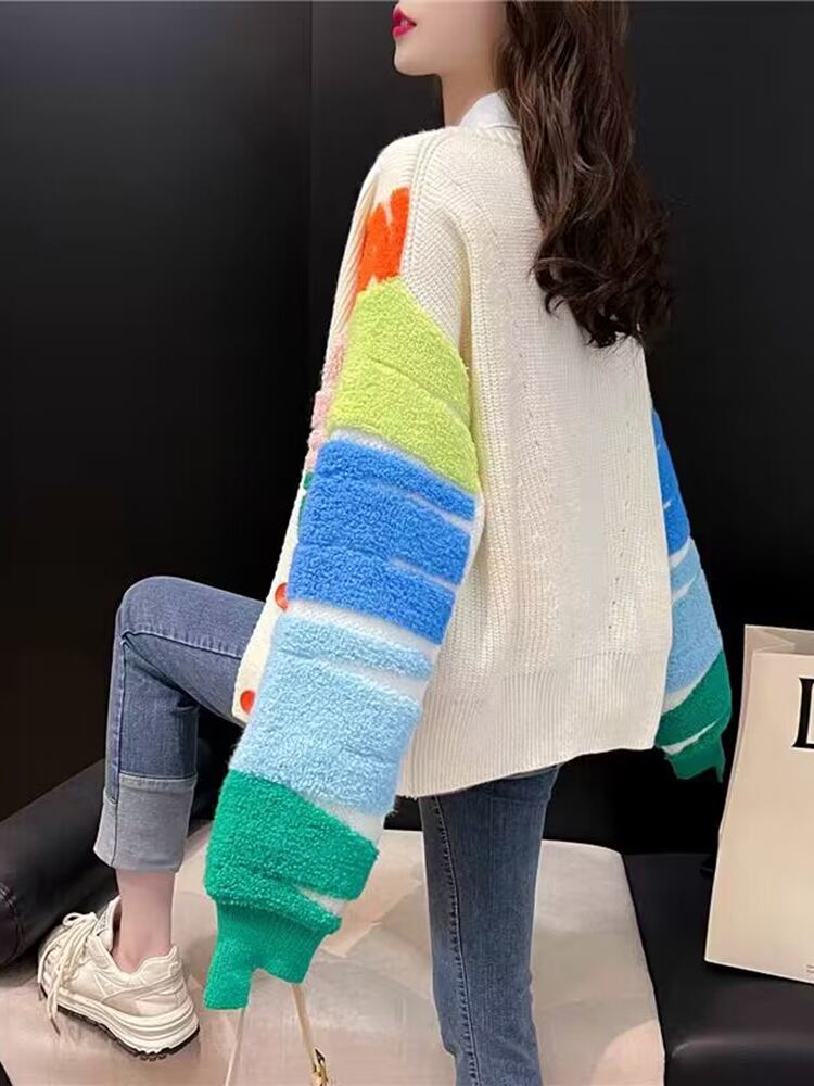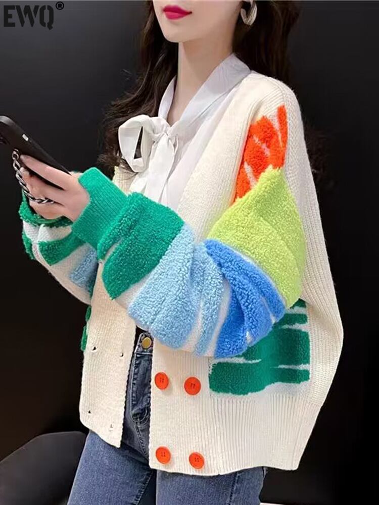 [EWQ] カラフル刺繍カーディガンコート甘い長袖コントラストルーズセータージャケット秋潮ニットコート ロング レッド 大人ガーリー スウィート キュート カジュアル オータム 秋物