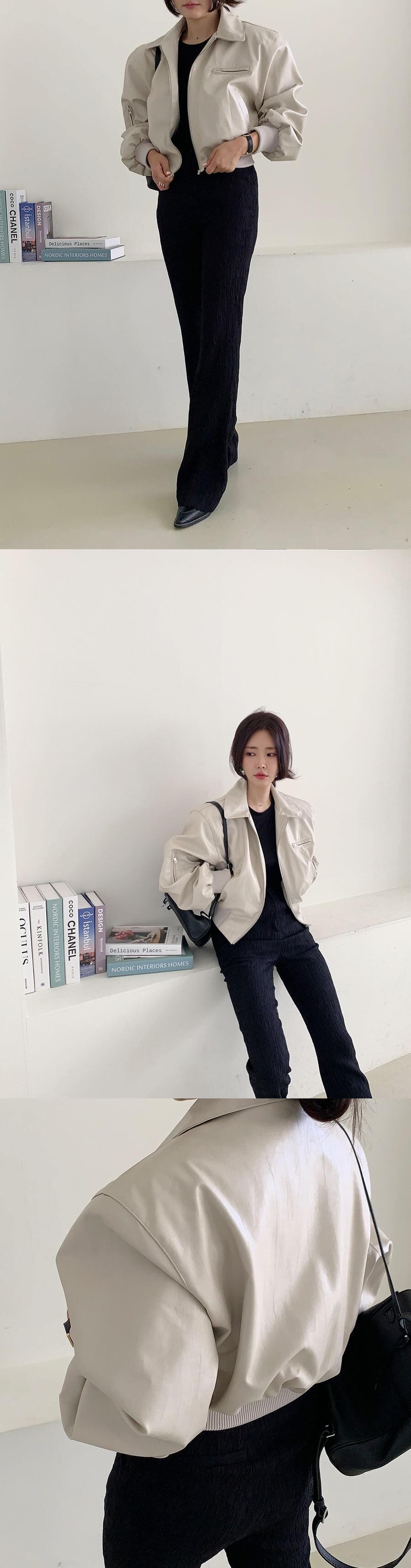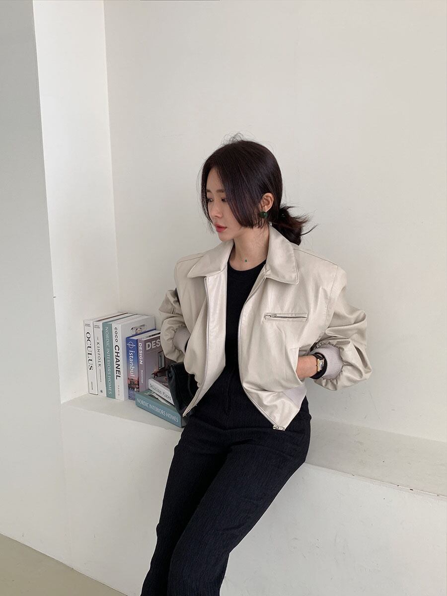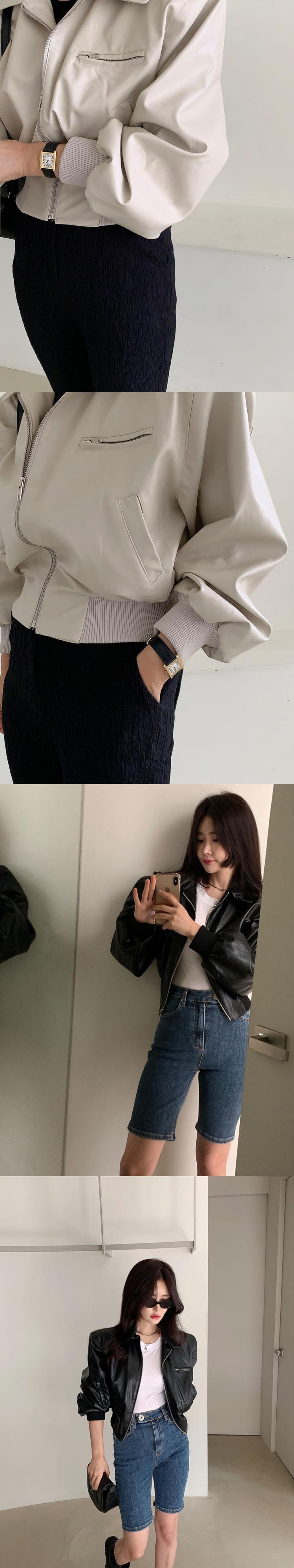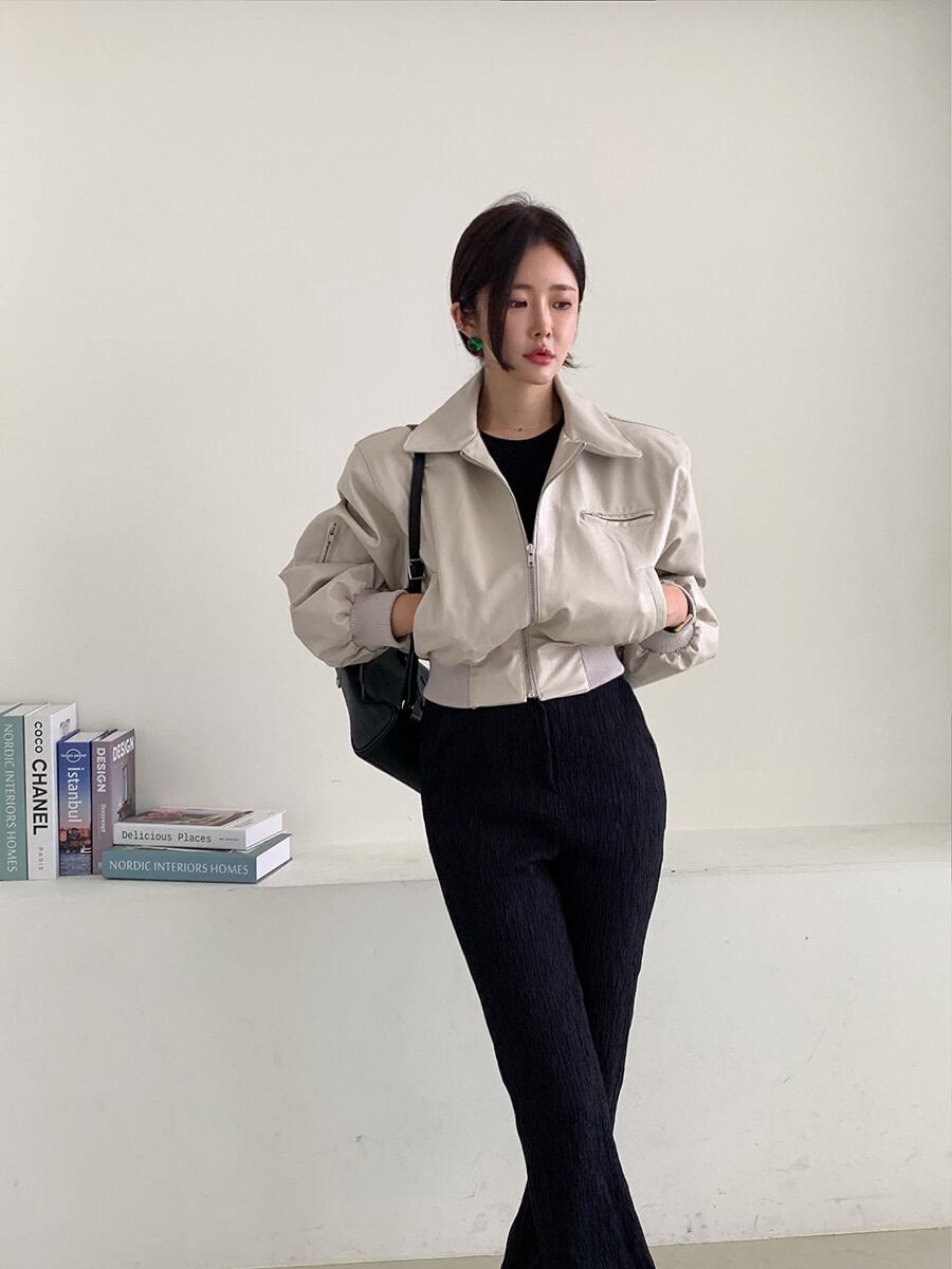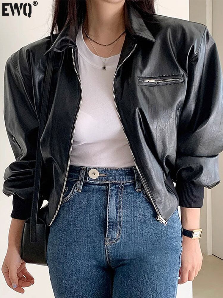 [EWQ] ラペルランタンスリーブプリーツジッパーストリートショート PU レザージャケット秋シンプルスエードコート スウェード オータム 秋物