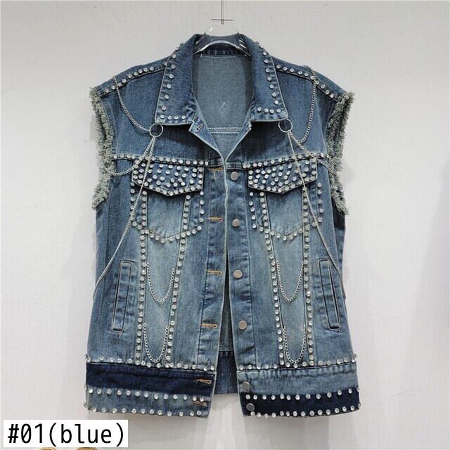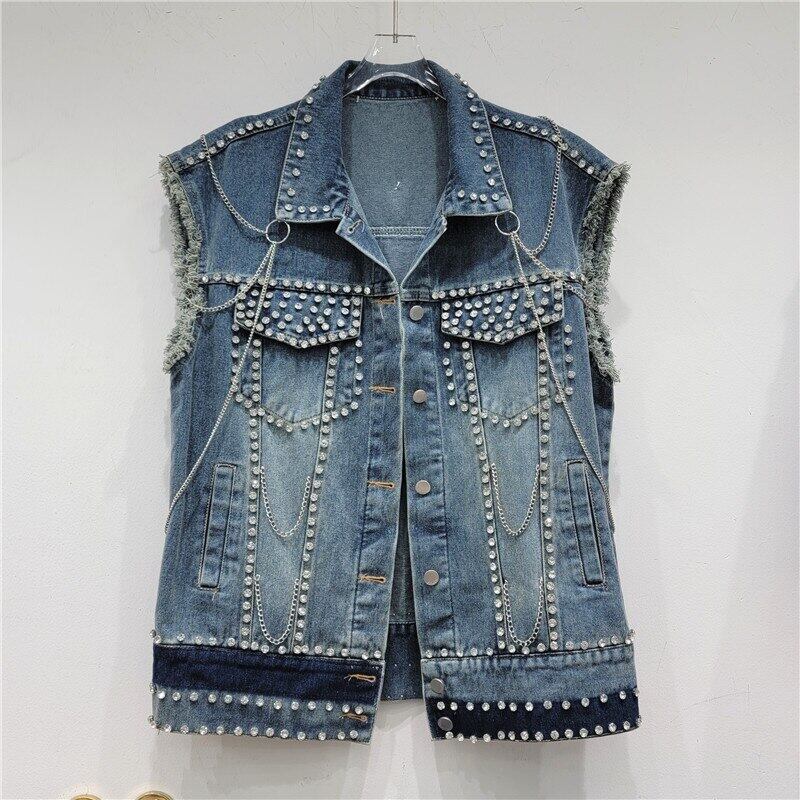 [EWQ] チェーン装飾デニムベストダイヤモンドパッチワークブルーノースリーブジャケット夏潮チョッキ 6U2547 サマー 夏物