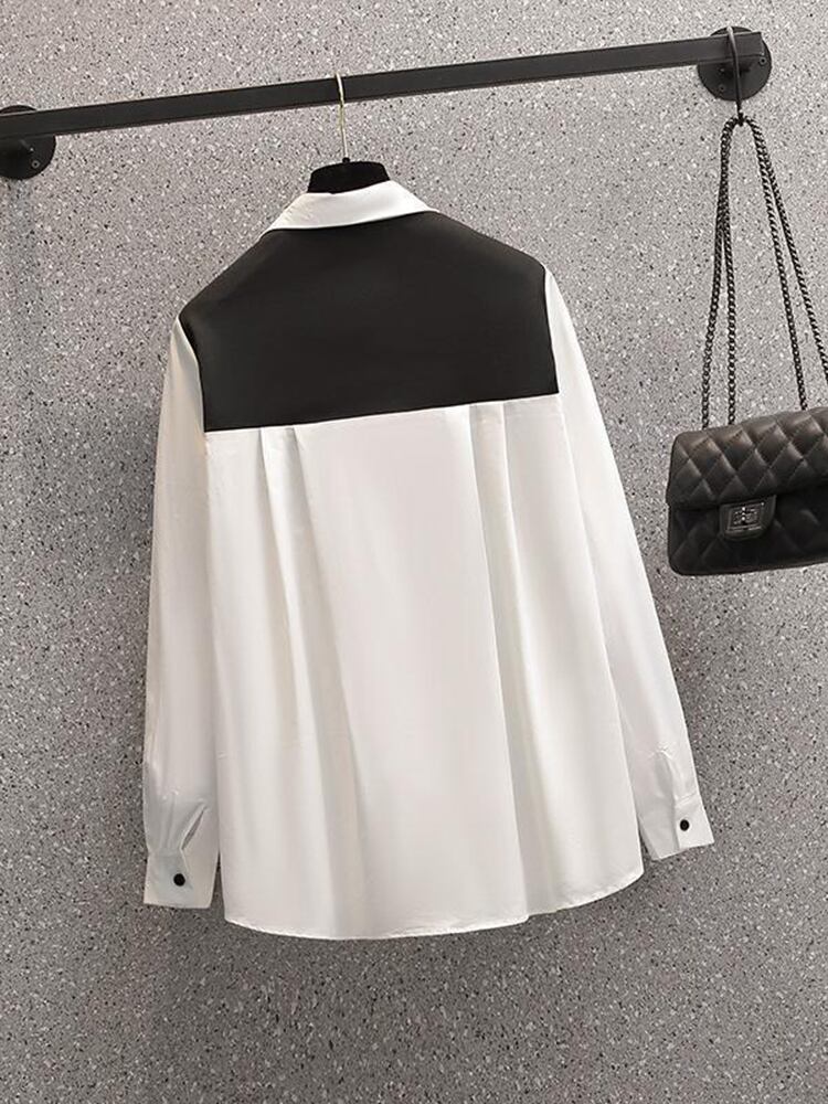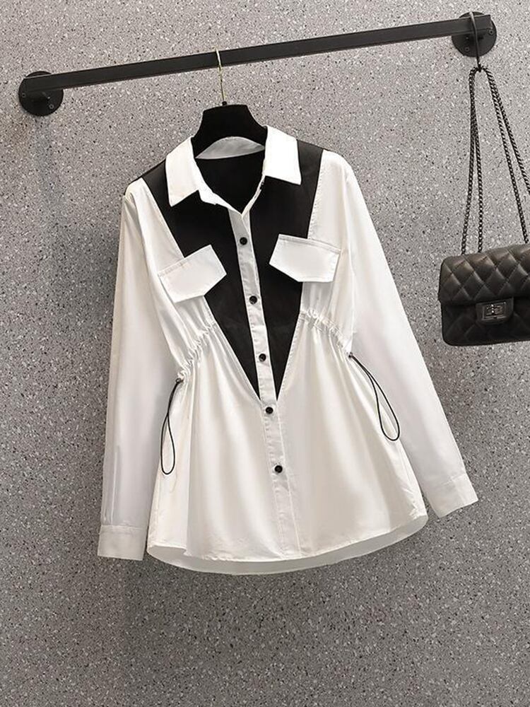 [EWQ] ホワイトブラックパッチワークシャツシングルブレスト巾着ビッグサイズ秋潮長袖ルーズトップス ロング オータム 秋物