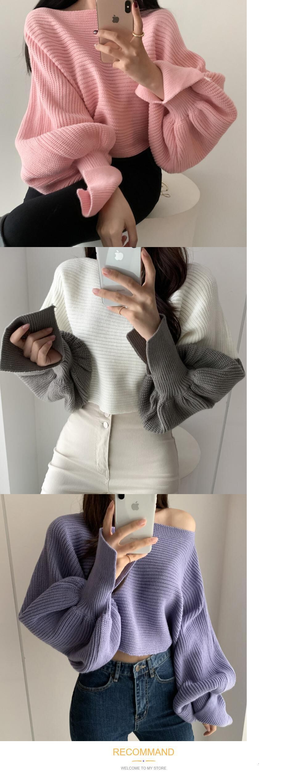 [EWQ] ランタンスリーブコントラストカラールーズセーター秋美しいパッチワークプルオーバーニットトップ オータム 秋物
