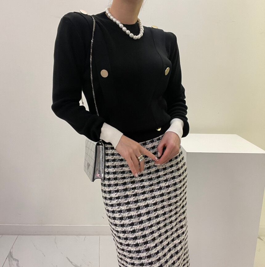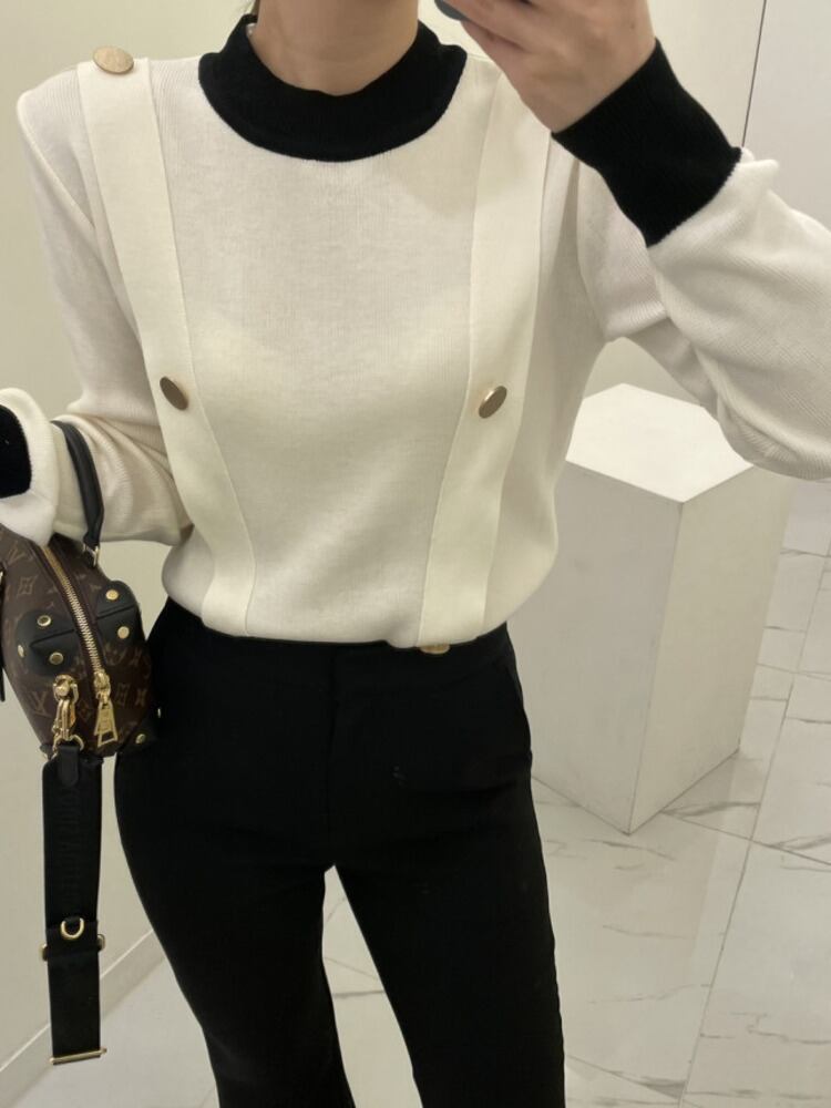 [EWQ] O ネックコントラストカラーセーターメタルバックル装飾秋冬潮プルオーバーニットトップ 6U3552 オータム 秋物 ウィンター 冬物 Oネック