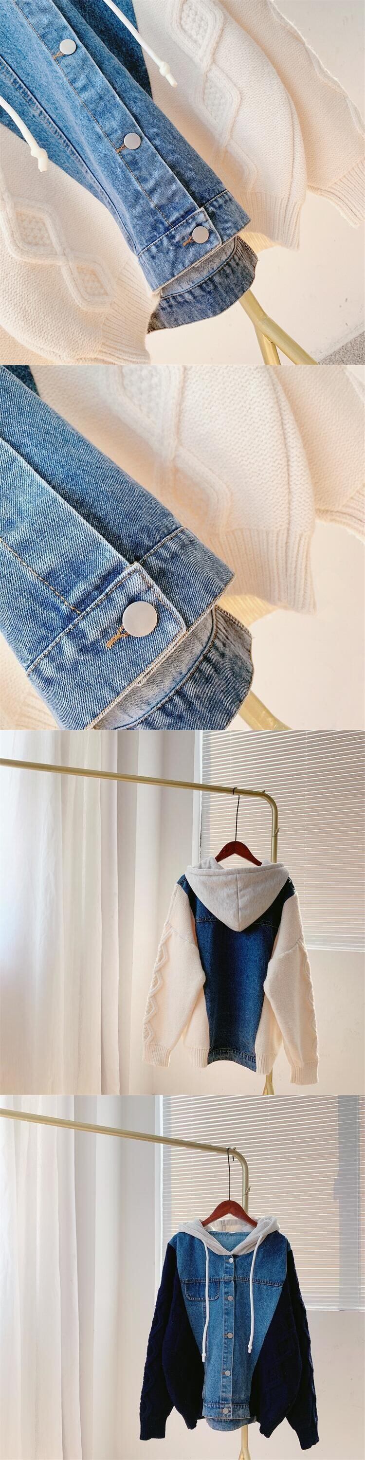 [EWQ] デニムパッチワークフード付きカーディガンコートシングルブレストセータージャケット秋冬ルーズ生き抜く 10 オータム 秋物 ウィンター 冬物