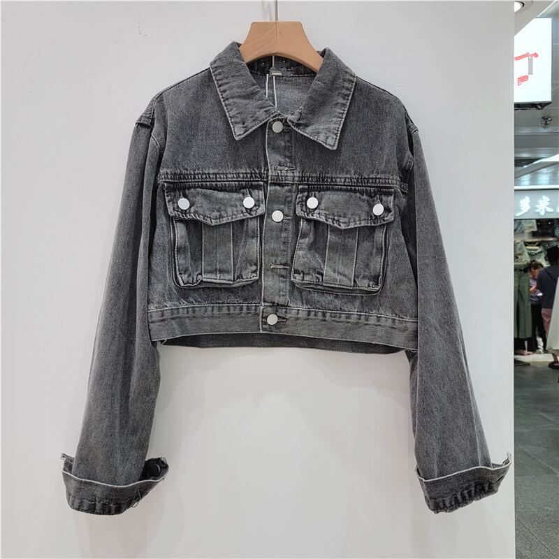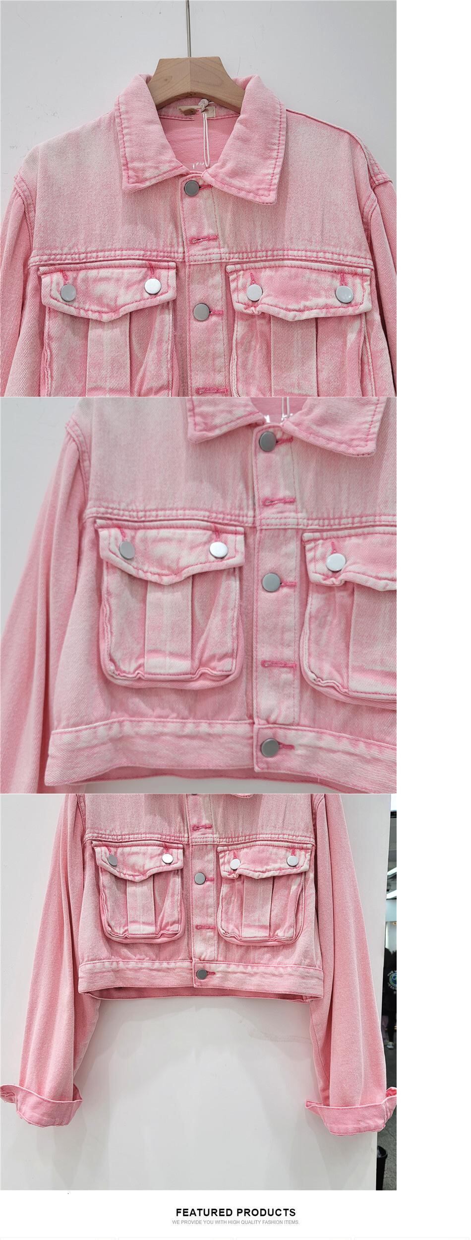 [EWQ] ピンクポケットパッチワークデニムジャケットシングルブレスト長袖ルーズジャケットコート秋潮生き抜く ロング オータム 秋物