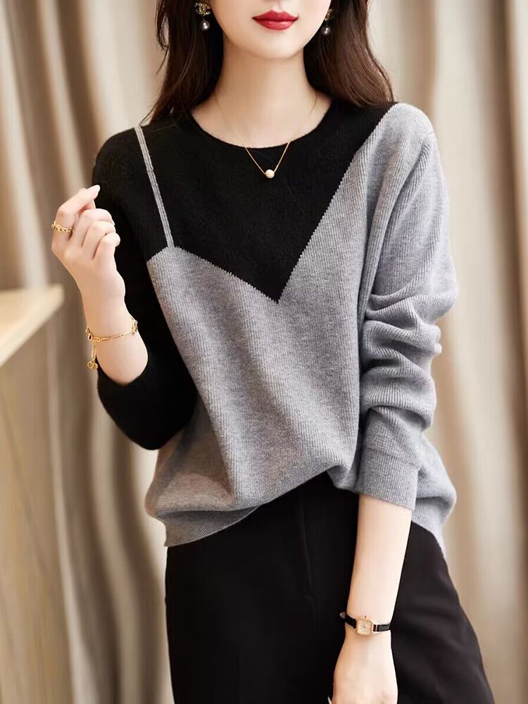 [EWQ] フェイクツーピースセーター長袖ルーズパッチワークコントラストカラー O ネックプルオーバーニットトップ秋潮 ロング オータム 秋物 Oネック