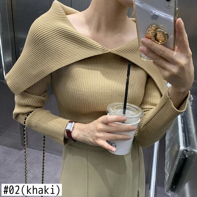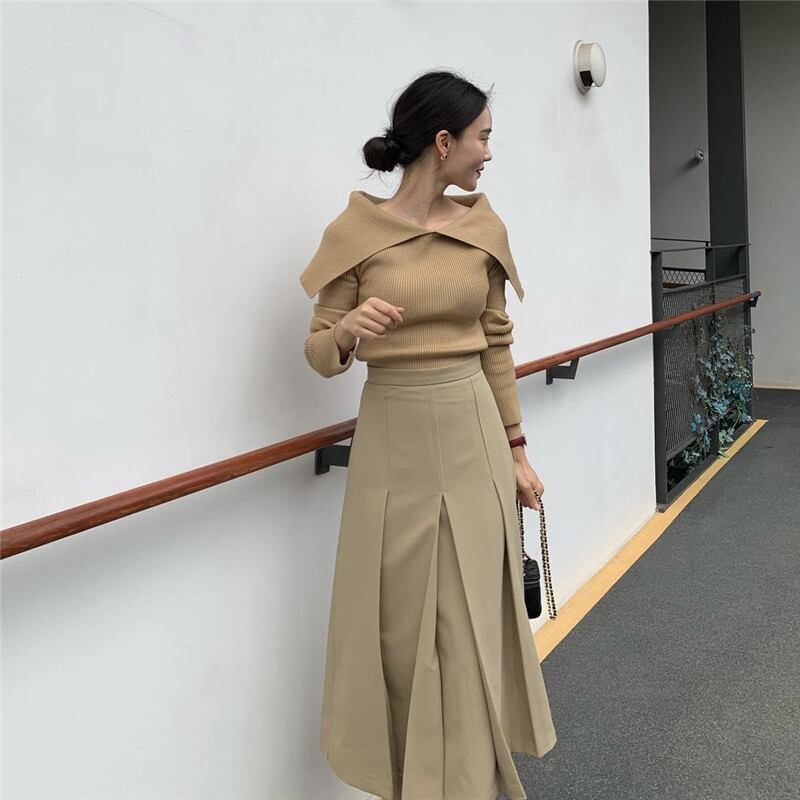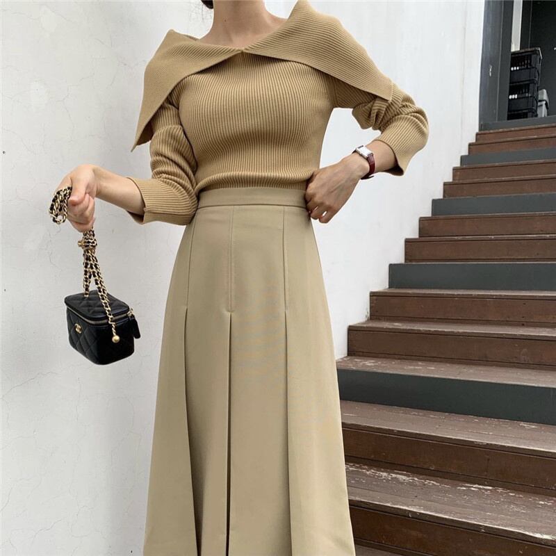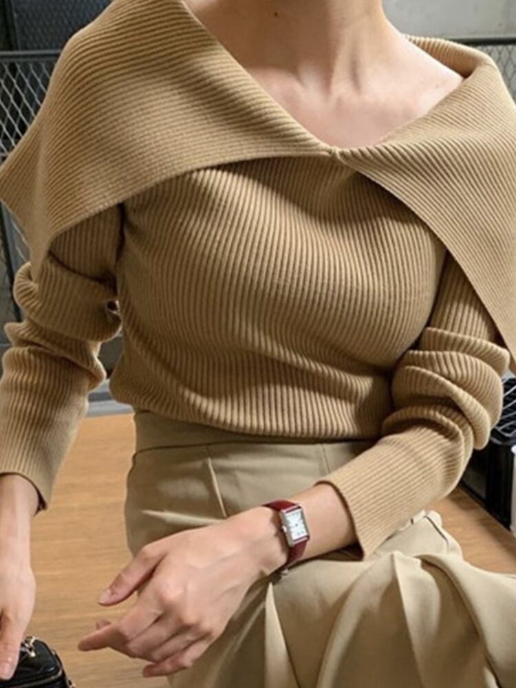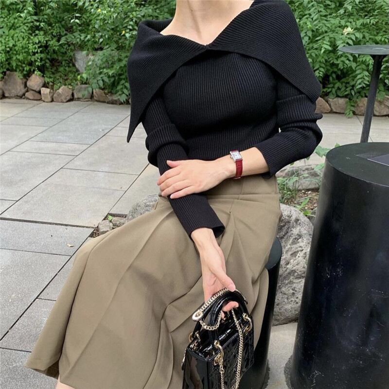 [EWQ] 大きラペルスプリットセータースリムフィット弾性長袖プルオーバーニットトップ秋冬ニットトップス ロング エラスティック 伸縮 オータム 秋物 ウィンター 冬物