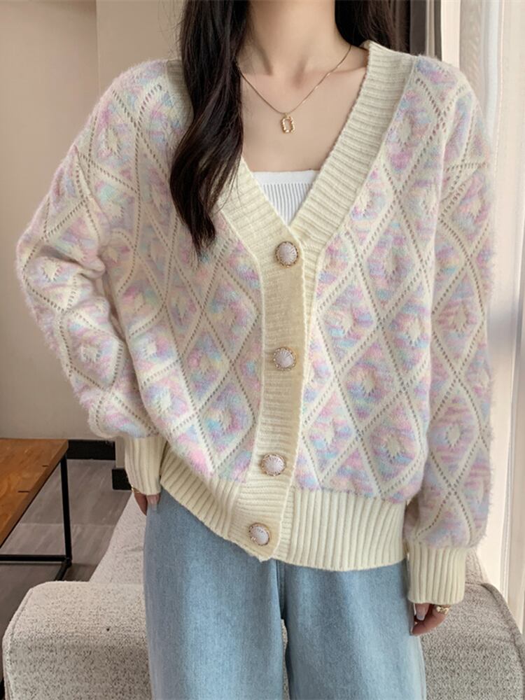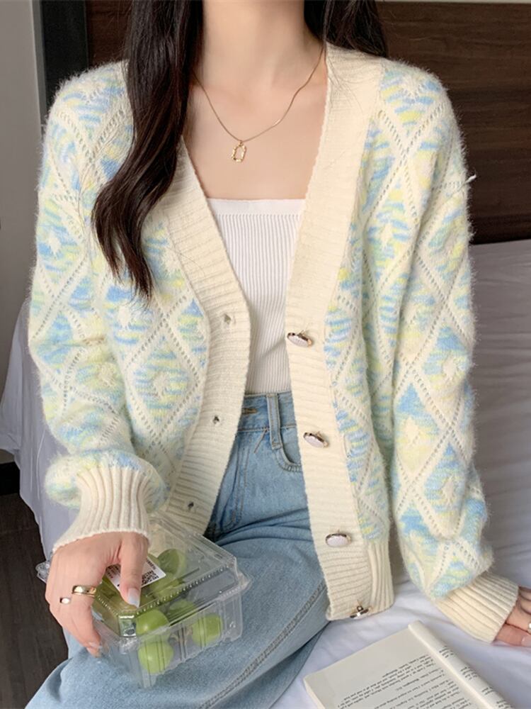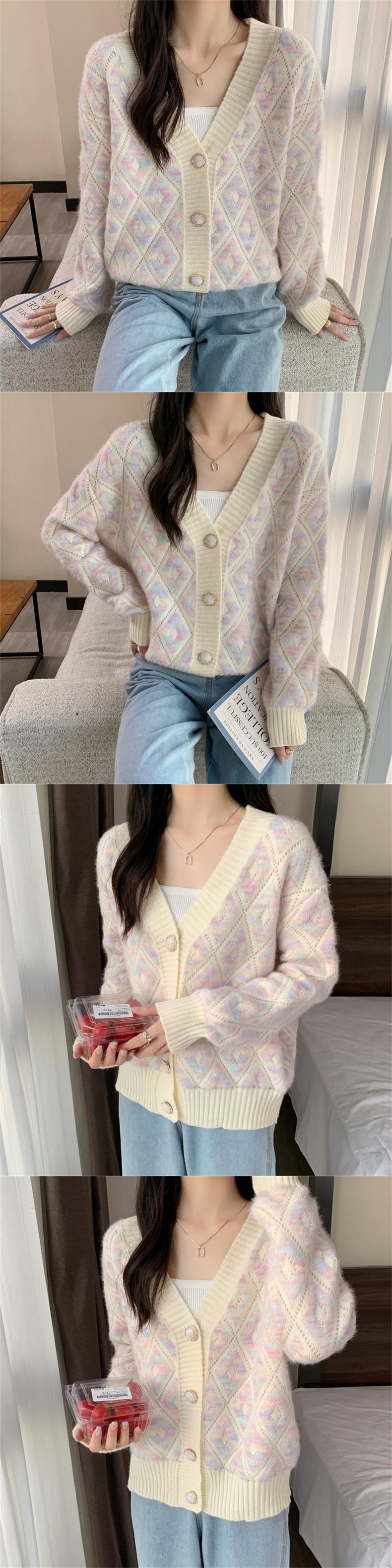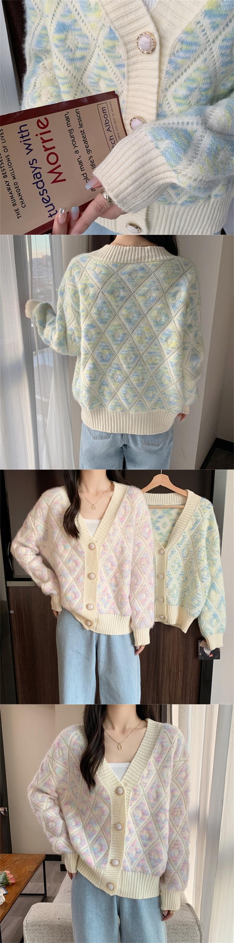 [EWQ] カラフルチェック柄 Vcontrast カーディガンコート長袖シングルブレストセータージャケット秋潮コート ロング オータム 秋物