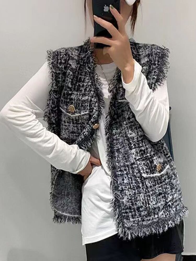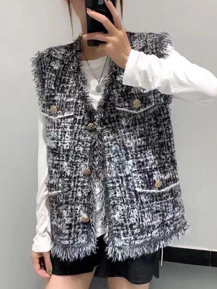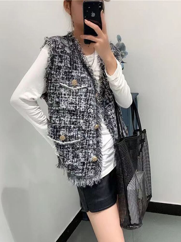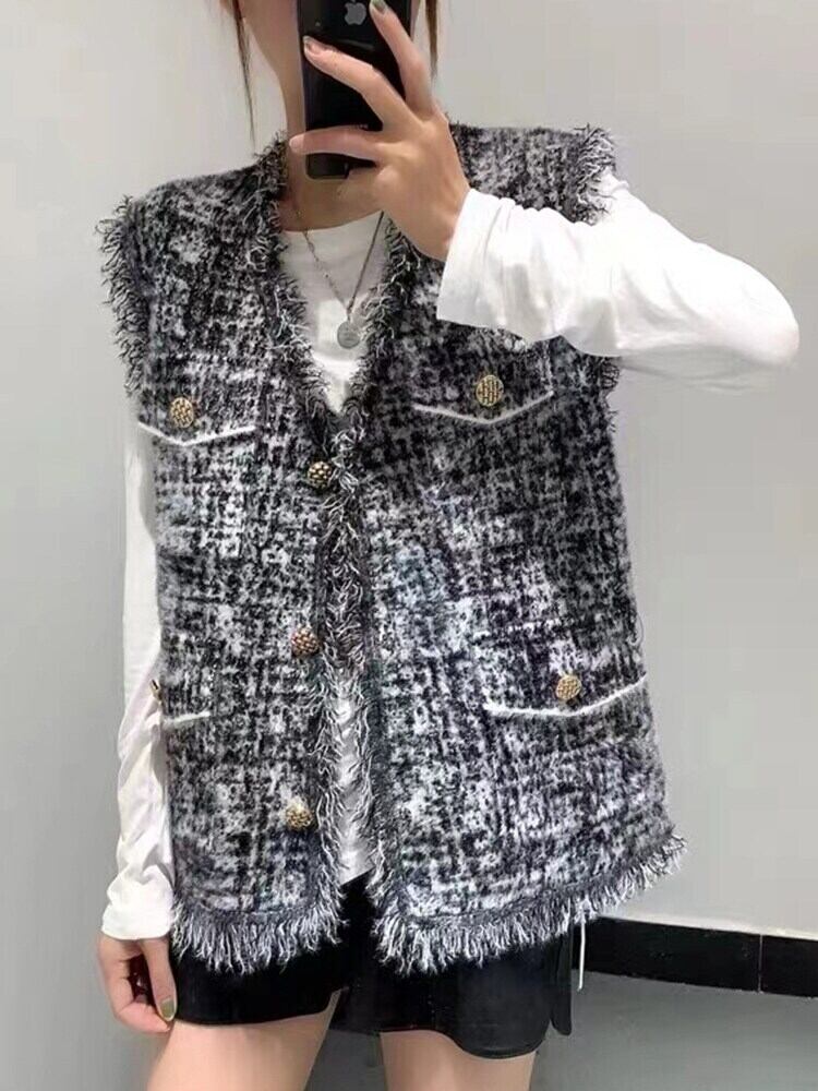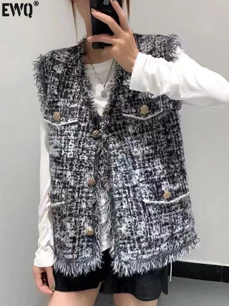 [EWQ] ミンクフリースコントラストニットベストポケットパッチワークシングルブレストノースリーブセータージャケット秋潮トップ オータム 秋物
