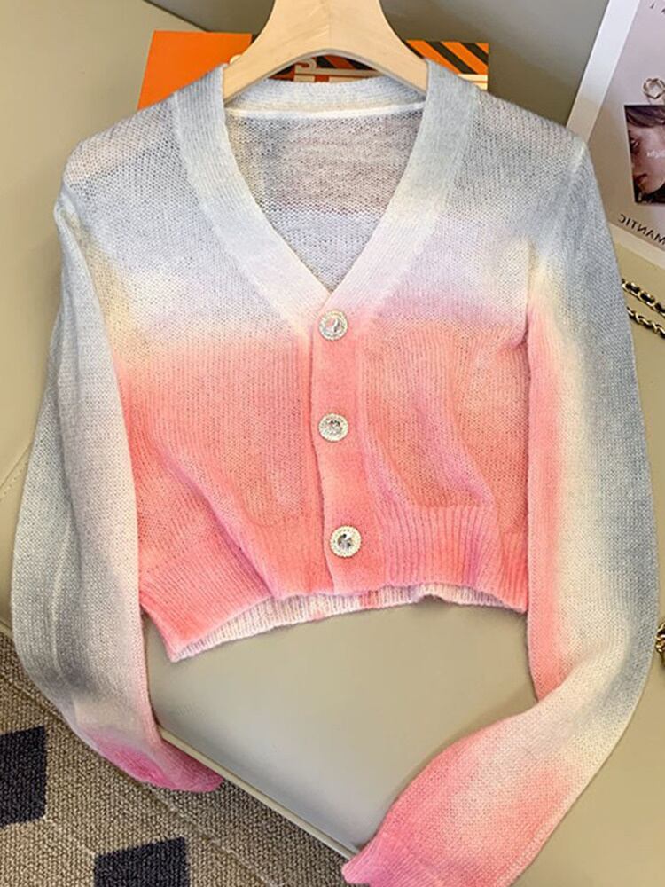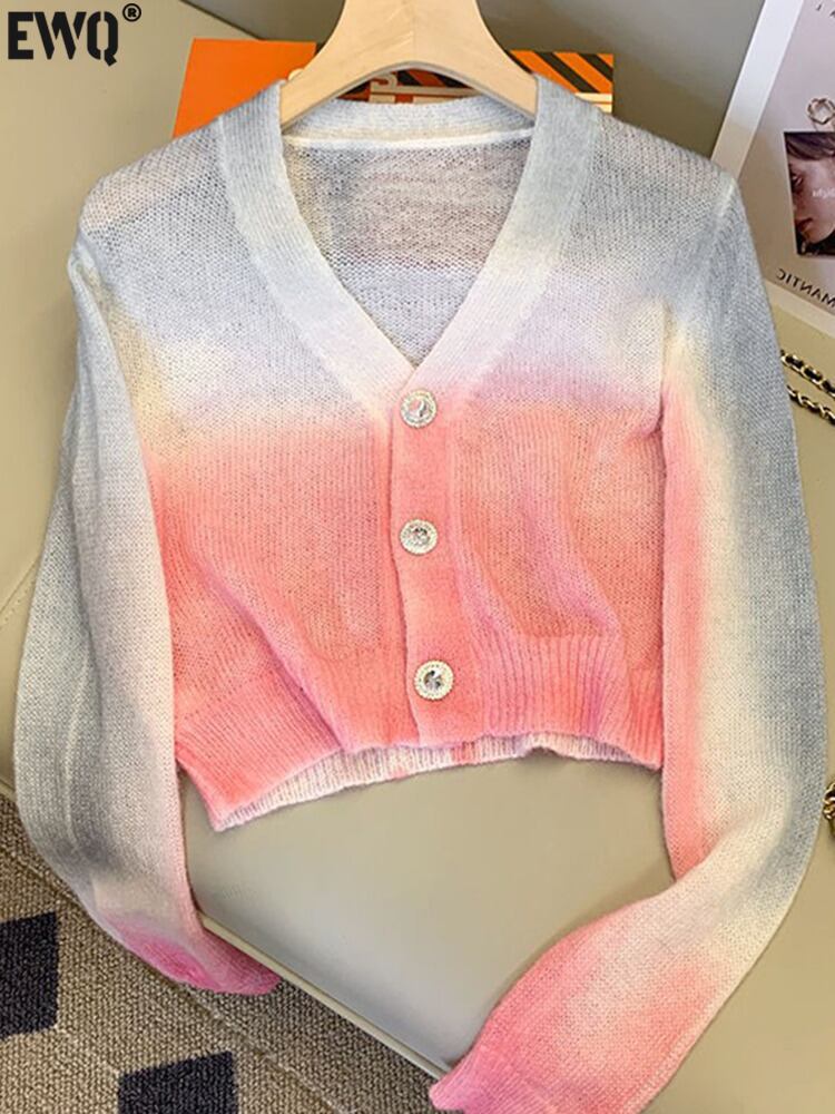 [EWQ] レインボーグラデーション V ネックレディースニット長袖ニット服秋トレンドシックトップス ロング オータム 秋物 Vネック