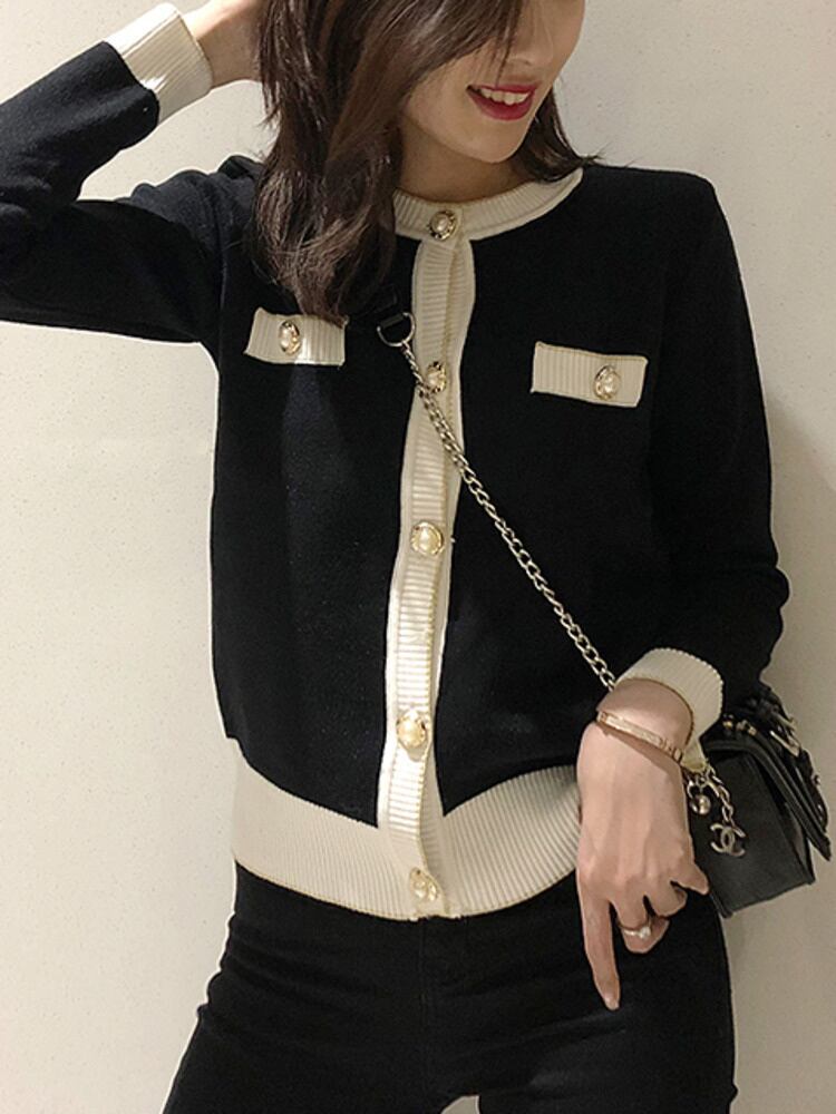 [EWQ] O ネックコントラストカラーパッチワークジャケット秋長袖シングルブレストコートトップス ロング オータム 秋物 Oネック