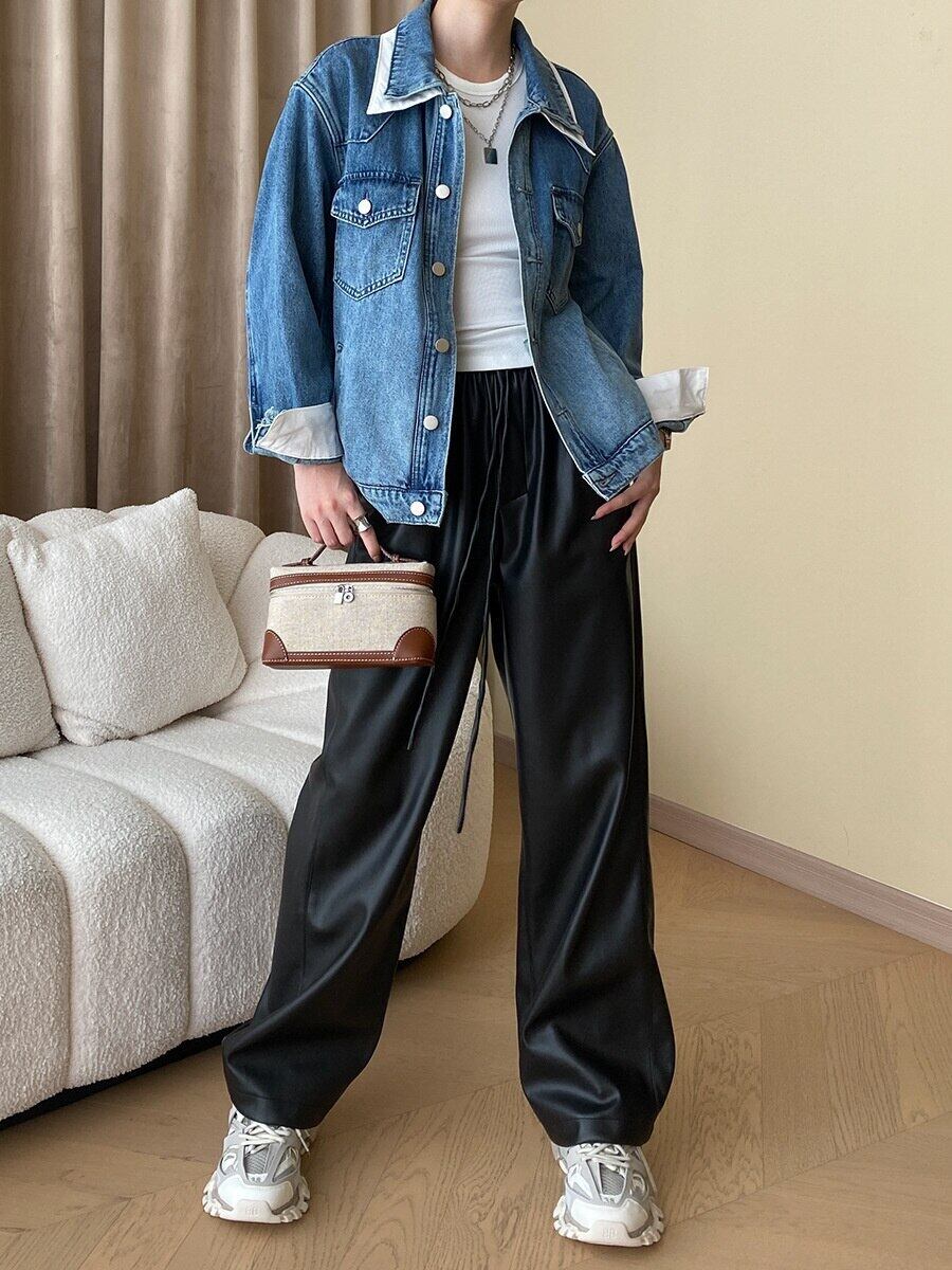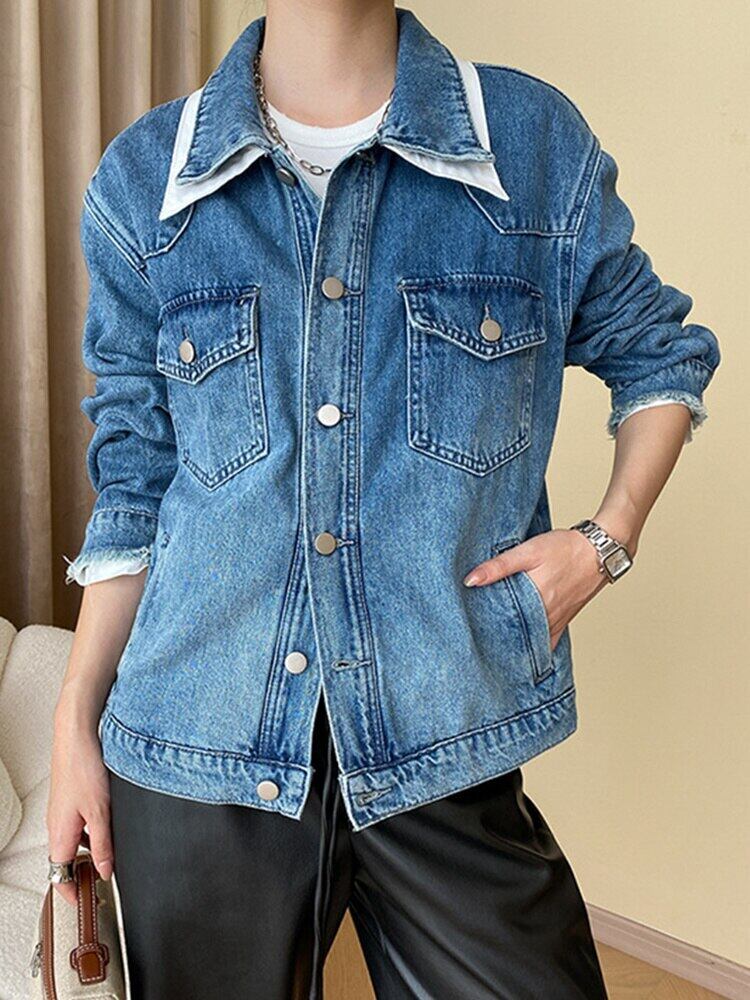 [EWQ] コントラスト ダブル襟 デニム ジャケット レディース 長袖 シングルブレスト ゆったり 秋潮 グラデーション コート 16U2237 ロング オータム 秋物