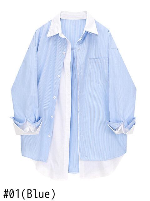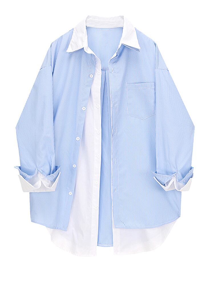 [EWQ] ブルーストライプコントラストビッグサイズブラウスラペル長袖ルーズパッチワークシャツ春秋 16U1356 ロング スプリング 春物 オータム 秋物