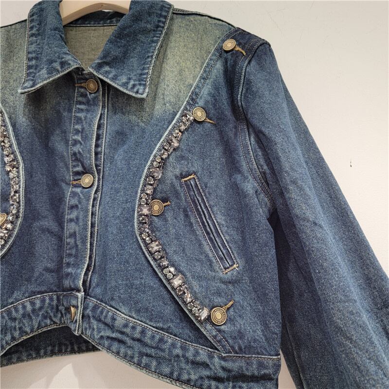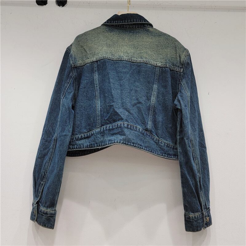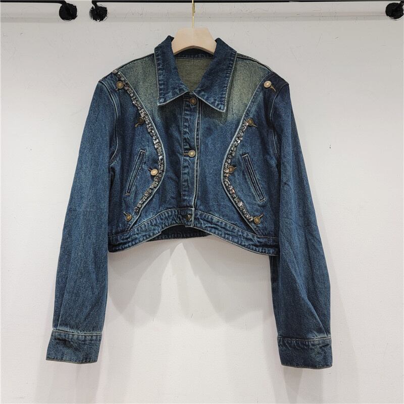 [EWQ] ダイヤモンドデニムジャケットパッチワークシングルブレストストリートショートジャケット秋潮アウター 32 オータム 秋物