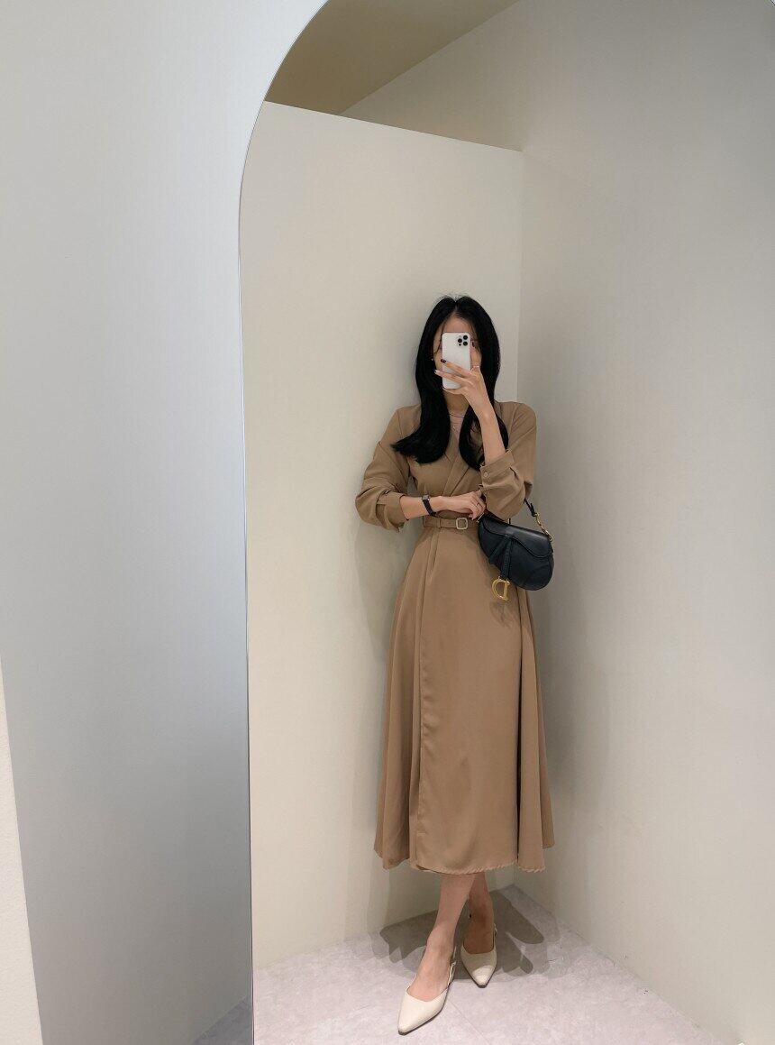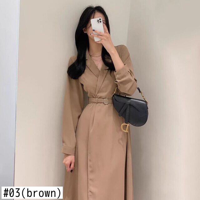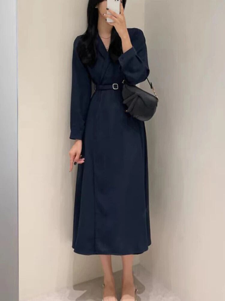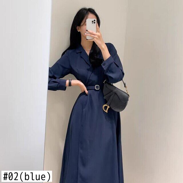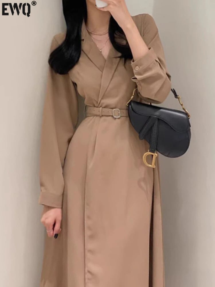 [EWQ] ノッチドレス長袖スリムウエストレースアップドレス秋潮 Vestido ロング オータム 秋物