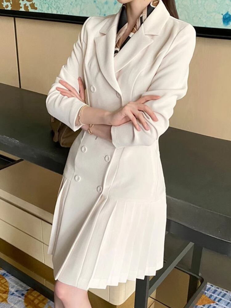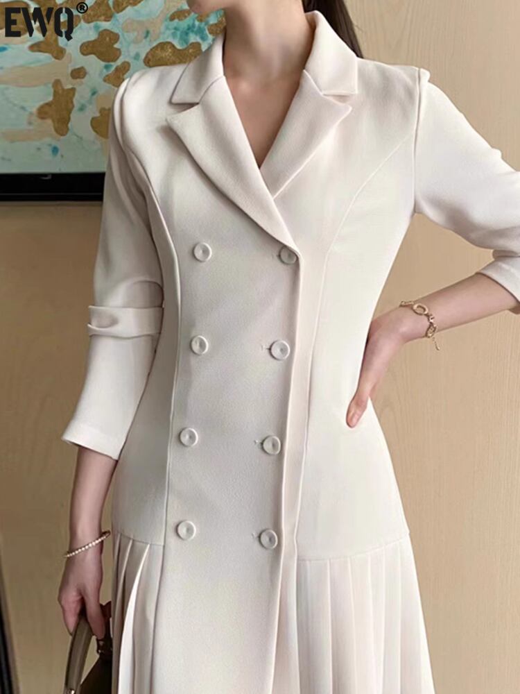 [EWQ] ダブルブレストノッチドレス気質長袖プリーツスプライシングブレザードレス秋 6U4177 ロング オータム 秋物