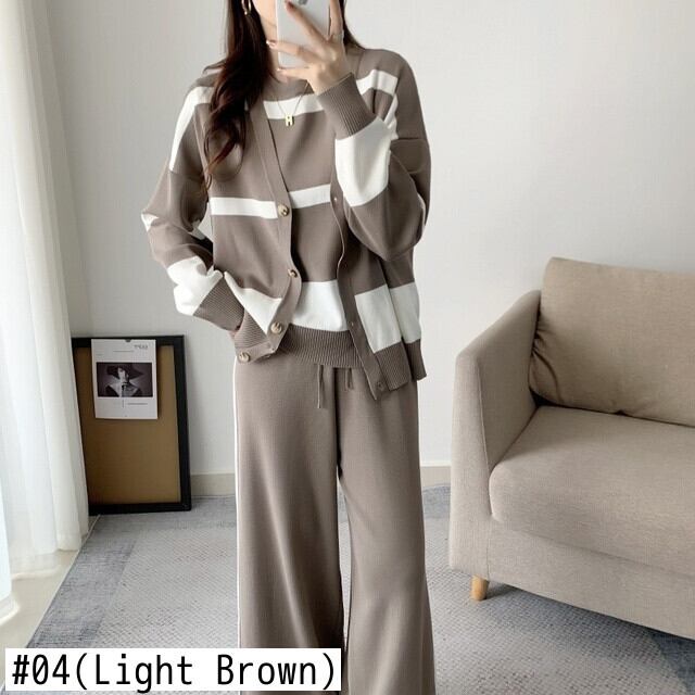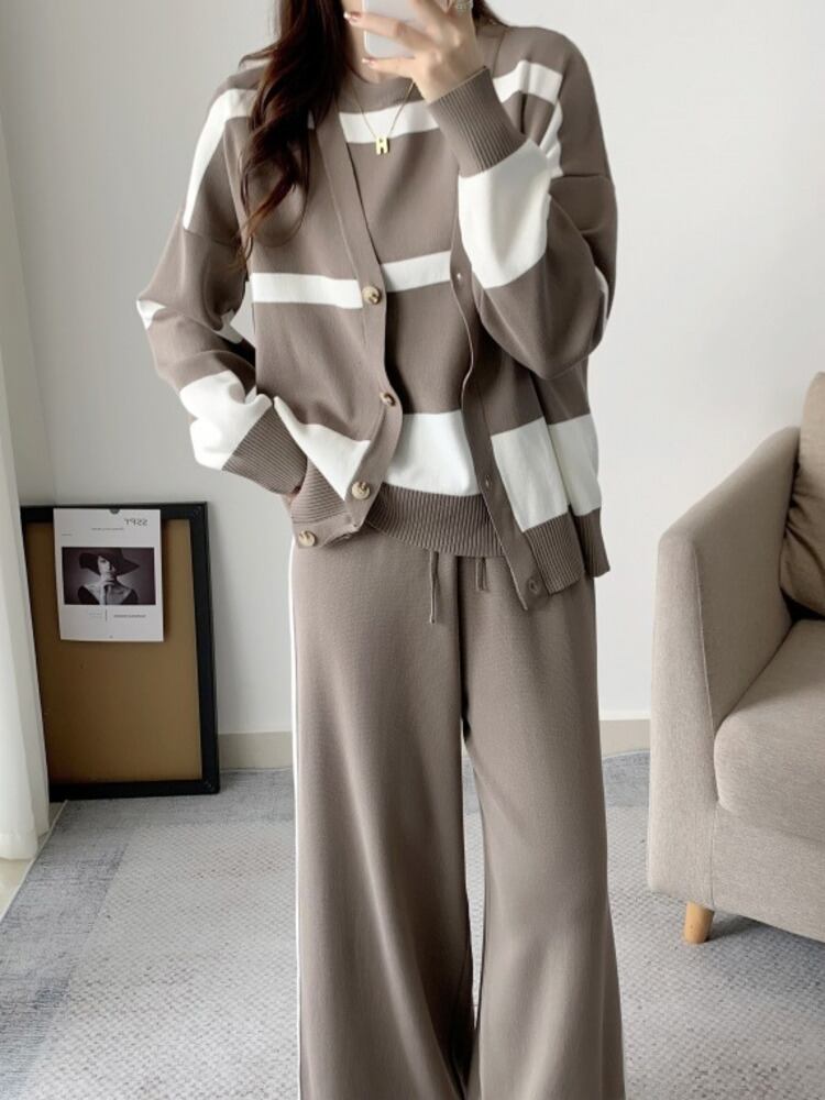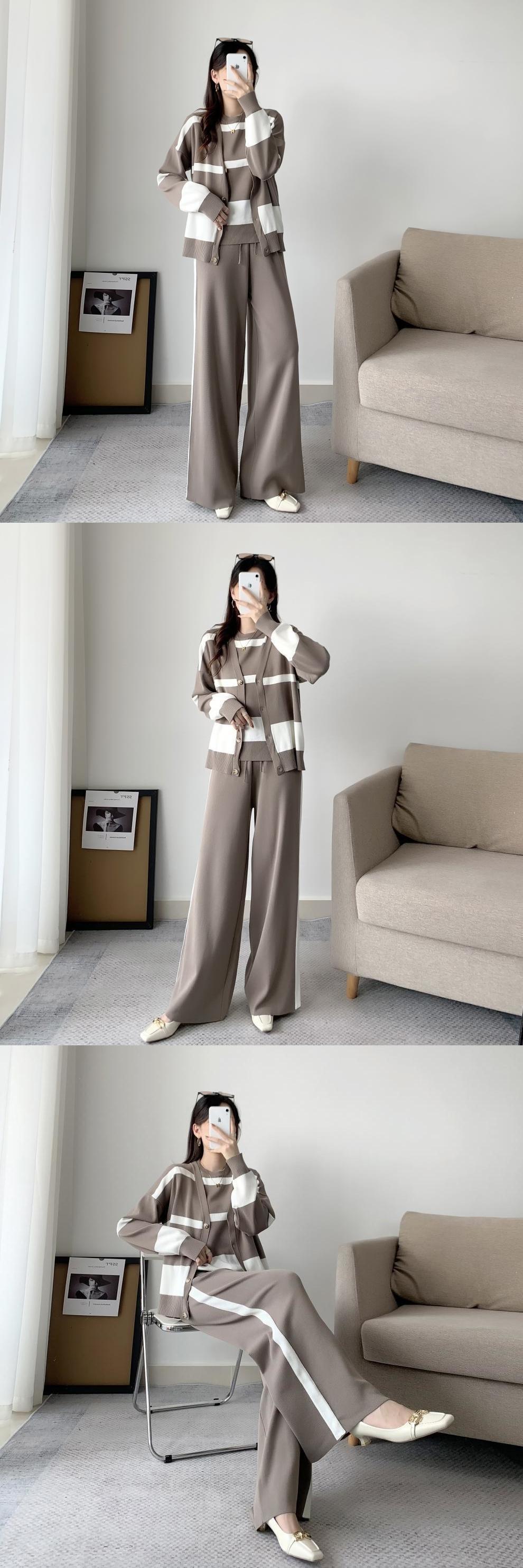 [EWQ] ニット 3 セット ストライプ カーディガン ノースリーブ ベスト + ウエスト レースアップ パンツ 秋潮ニット スーツ オータム 秋物 3セット